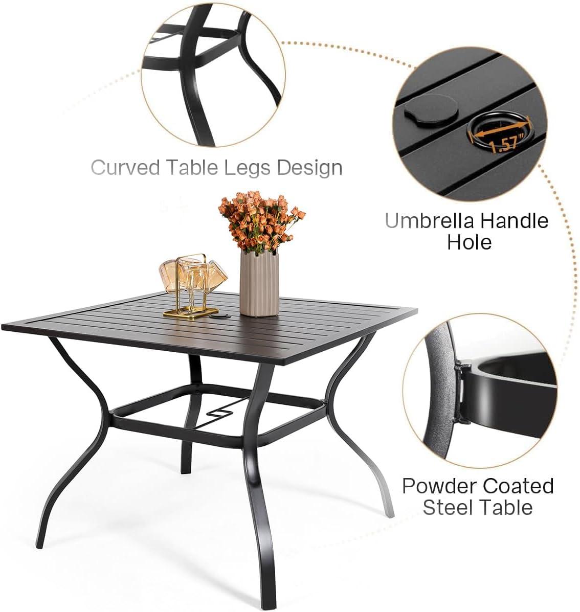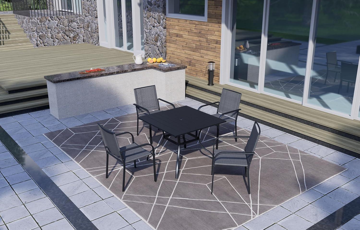 After spending considerable time with this outdoor dining set,we appreciate its space-saving design and durability. The lightweight stackable chairs make storage and movement effortless, especially if you have limited patio space. The powder-coated steel frame not only offers a sleek, modern look but also ensures weather resistance and long-term stability, thanks to its thoughtfully curved legs. The 35-inch square table with an umbrella hole fits perfectly into intimate outdoor dining areas, making it ideal for small gatherings or casual family meals.
