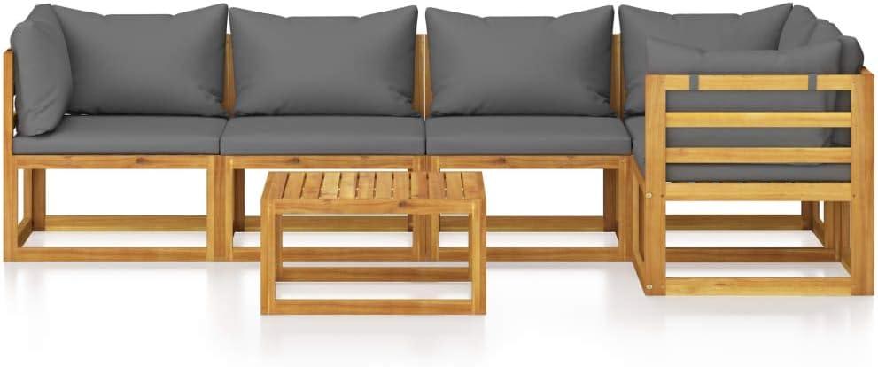Late afternoon light slants ⁣across the oiled acacia and you⁢ notice ⁤the grain catch it like a soft ​sheen; the wood feels ​pleasantly ‍heavy when you rest yoru‍ palm on the ‌arm. The 6 Piece Garden​ Lounge Set with Cushions (listed under that generic name, with no specific brand shown) settles into the patio with ‍a low, loungey stance—more a compact outdoor ⁣living area than a row ⁤of chairs. The cushions give under⁢ your weight with a familiar, slightly springy resistance and their ​covers pull off easily when you test a corner. From across the yard the dark-gray frame⁢ and honeyed wood balance each other,⁢ and the small tea table ⁢reads as an ⁣anchor⁢ rather than‌ an afterthought. It​ quietly changes the corner’s scale, making⁤ the space feel measured in bodies and conversation ⁣rather of paving stones.