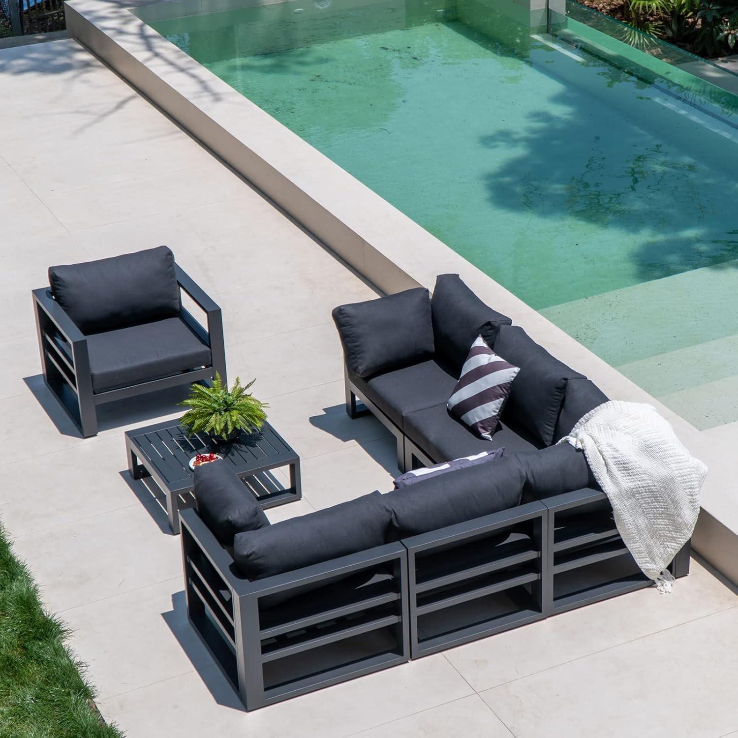 Our outdoor area has been completely transformed thanks to this sleek, modular furniture set. The versatility of the sectional pieces lets us effortlessly adapt the layout for intimate gatherings or larger social events, giving us maximum flexibility without sacrificing style. The upgraded dark grey cushions provide not only comfort but also an elegant contrast to the clean lines and powder-coated aluminum frame, blending modern minimalism with robust durability. We appreciate how lightweight yet sturdy each component feels, making rearrangements a breeze while promising long-term weather resistance.
