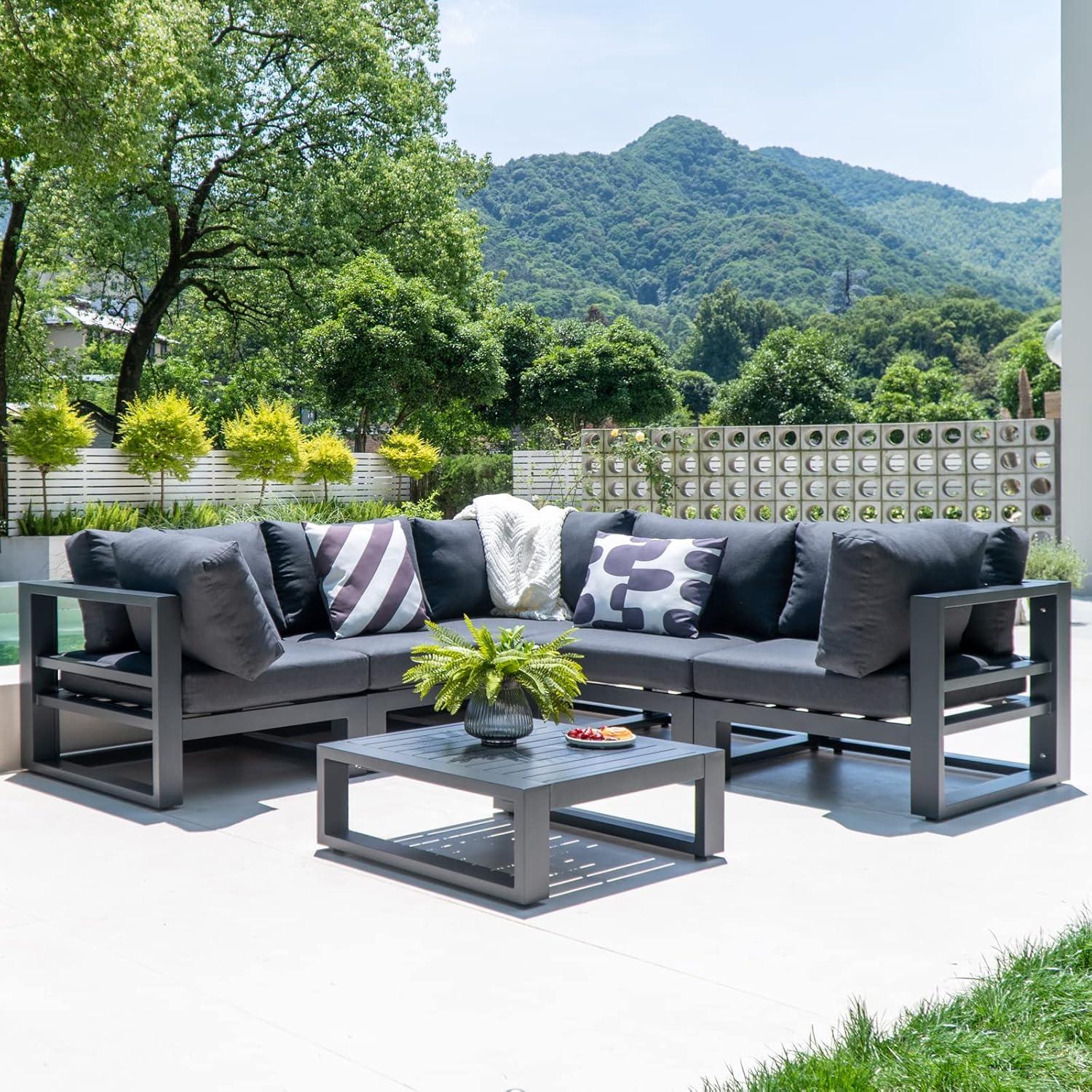 We appreciate the elegant, modern aesthetic conveyed by the clean lines and minimalistic styling of this outdoor sectional set. Its modular design grants us the flexibility to effortlessly rearrange seating configurations to suit different social occasions or personal preferences. The dark grey cushions not only complement the powder-coated aluminum frame with a sleek contrast but also provide remarkable comfort thanks to the sponge padding, making long outdoor lounging occasions enjoyable. Additionally, the cushion covers are thoughtfully designed to protect against everyday dirt, debris, and morning dew, helping maintain a fresh look over time.