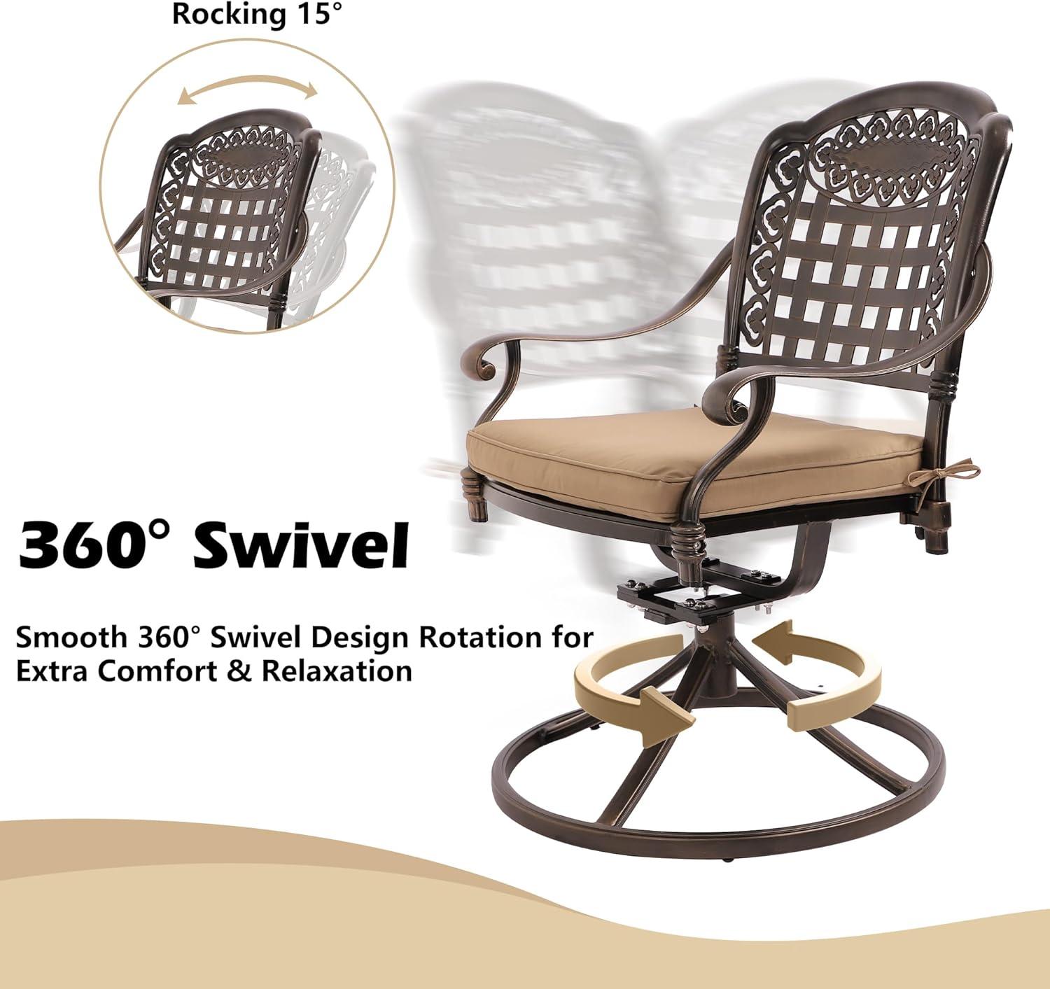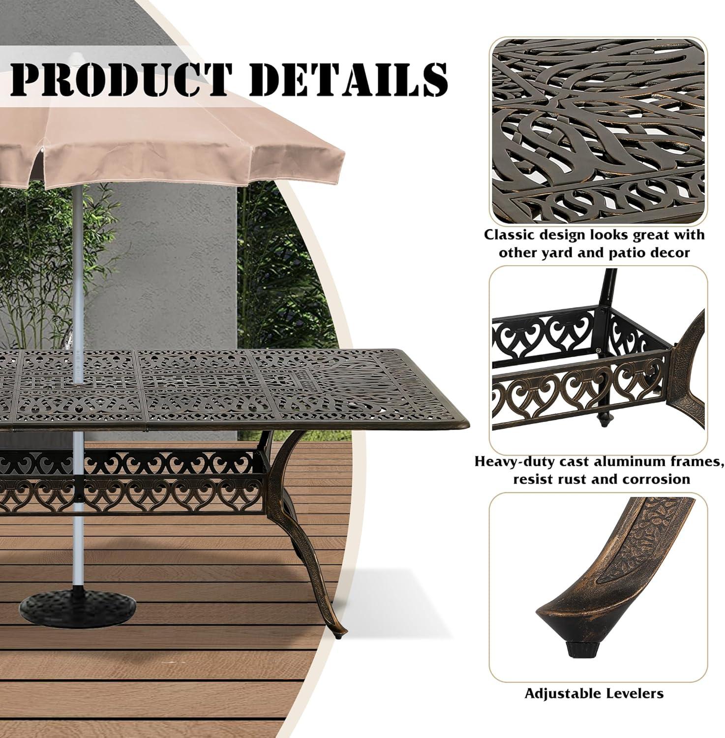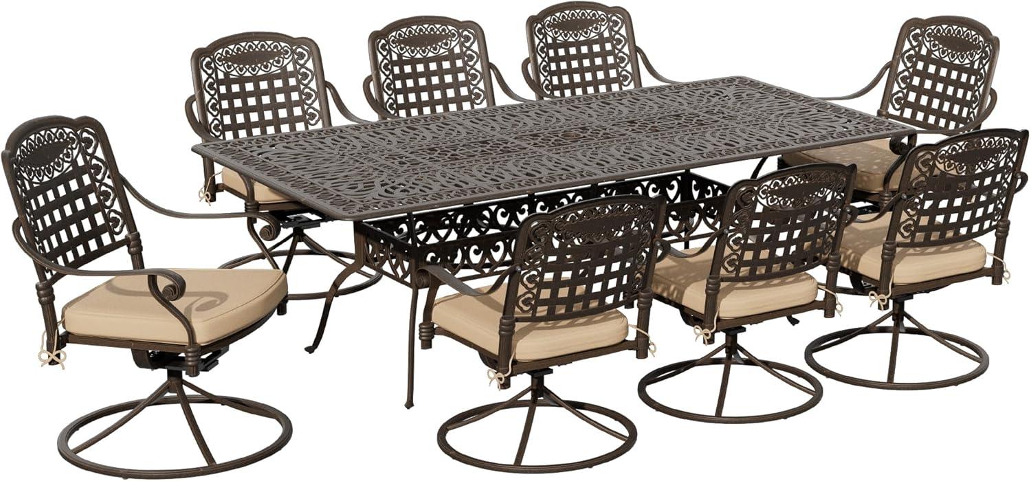 Midday light threads⁢ through the table’s lattice‍ and throws a filigree⁢ across your deck; you notice the set’s presence before ‍you even sit. ⁣The listing calls it “9 Pieces Outdoor Dining ⁢Set,Cast Aluminum Retro Patio ​Dining ⁣Set”—I’ll refer to it as the retro cast‑aluminum‍ set—and in your backyard⁢ it reads as a ⁣long,low ‌anchor: a rectangular table⁤ flanked by eight ‍swivel chairs ​with khaki cushions. ⁤Run your hand along the edge and the aluminum is cool and faintly textured, lighter than it looks, ‍while the cushions give a thin, ⁢composed yield under your palm. When you turn, the chairs pivot smoothly and the umbrella ‌hole at the table’s ⁣center cuts⁣ a‌ practical, unsettled pause through the ⁤patterned⁤ top.