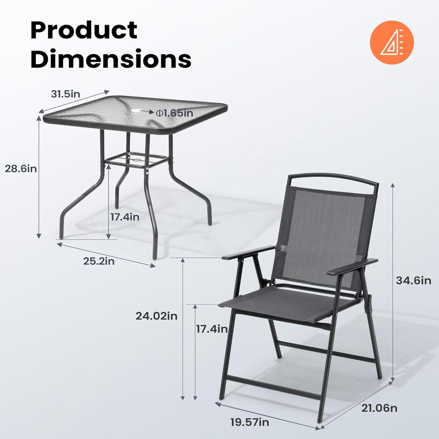 this patio set strikes an excellent balance between practicality and comfort.The foldable chairs make it a breeze to store and move around, perfect for those with limited space or anyone who likes to change their outdoor setup frequently. The breathable fabric and armrests offer surprising comfort, making it a great spot for long gatherings or casual meals. The tempered glass table not only adds a sleek touch but also includes a versatile umbrella hole that fits most umbrellas, making it adaptable to various weather conditions without compromising stability. The durable metal frame and sturdy materials ensure this set will hold up well for years to come.