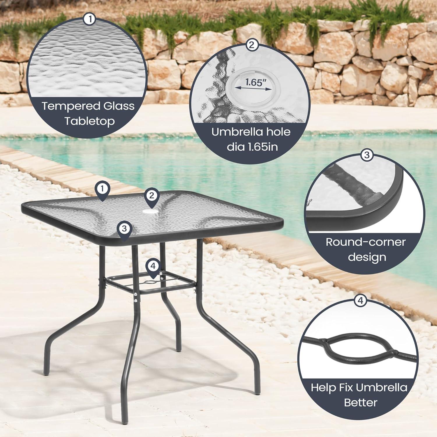 The glass top table impresses us with its sleek, tempered surface that feels sturdy and easy to clean. Its square design provides ample space for casual dining or enjoying coffee outdoors without feeling cramped. The 1.66-inch diameter umbrella hole is perfectly positioned in the center, designed to accommodate a wide variety of standard-sized patio umbrellas, enhancing usability on sunny days. When not in use, this hole can be neatly covered with a plastic cap, allowing for a smooth and uninterrupted tabletop experience.