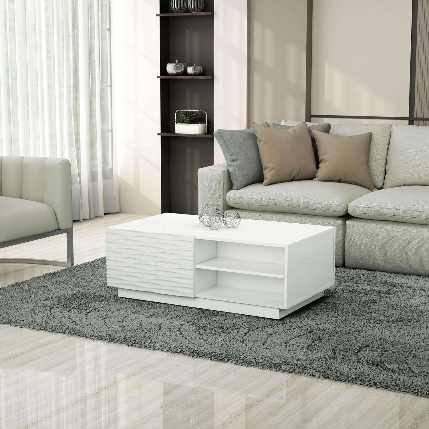 When you walk into the room, the table reads as a bright, low focal point rather than a heavy presence. The white gloss surface catches overhead and window light, throwing back a pale sheen that makes nearby colors — a wool rug, a leather sofa — look slightly more saturated in contrast. From a few paces away its clean silhouette and flush drawer faces read as a single plane; up close the soft reflections and faint seams become more obvious,and your hand notices the smooth,almost lacquered surface before your eyes register details.
