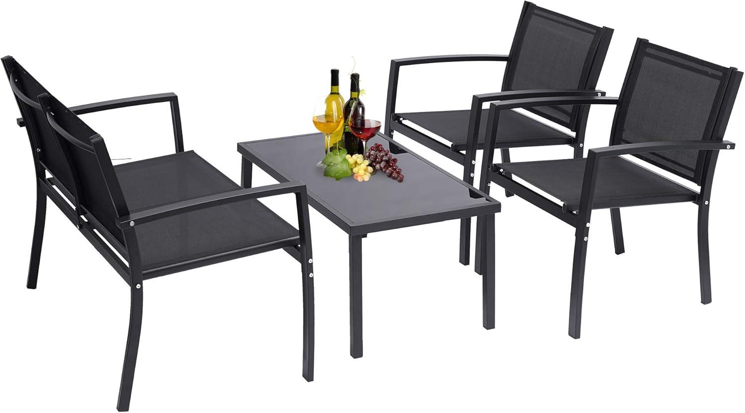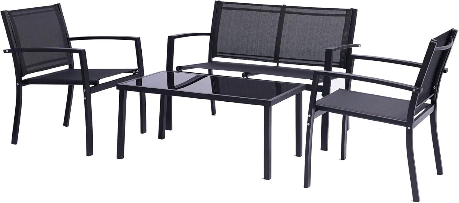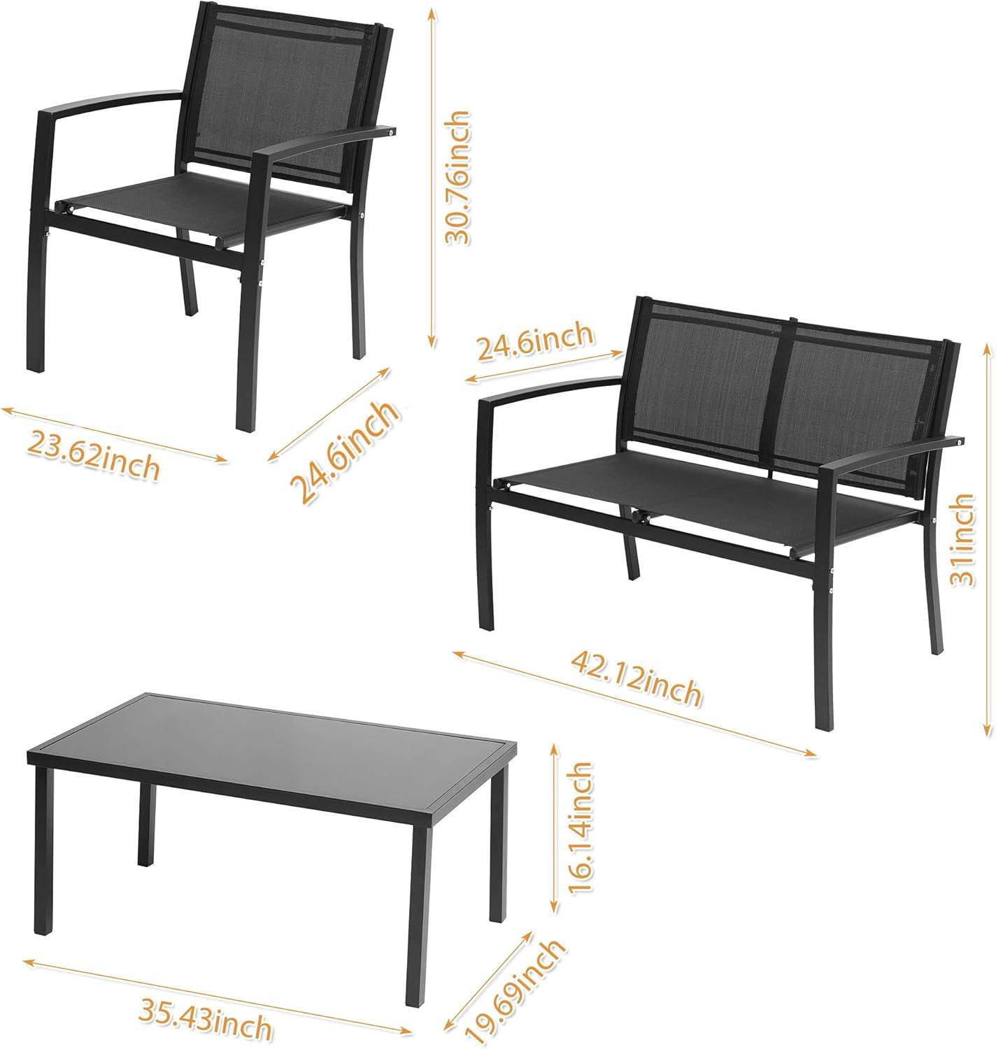 We appreciate how this set effortlessly blends modern minimalism with practical versatility, making it an ideal addition to any outdoor environment. The clean lines and matte black finish bring a sophisticated yet understated vibe, ensuring it complements various outdoor decors-from lush garden nooks to sleek poolside patios. The compact arrangement of a loveseat, two chairs, and a glass coffee table creates a cozy conversation nook without overwhelming the space, while the powder-coated steel frames and textilene fabric lend a contemporary, durable charm.