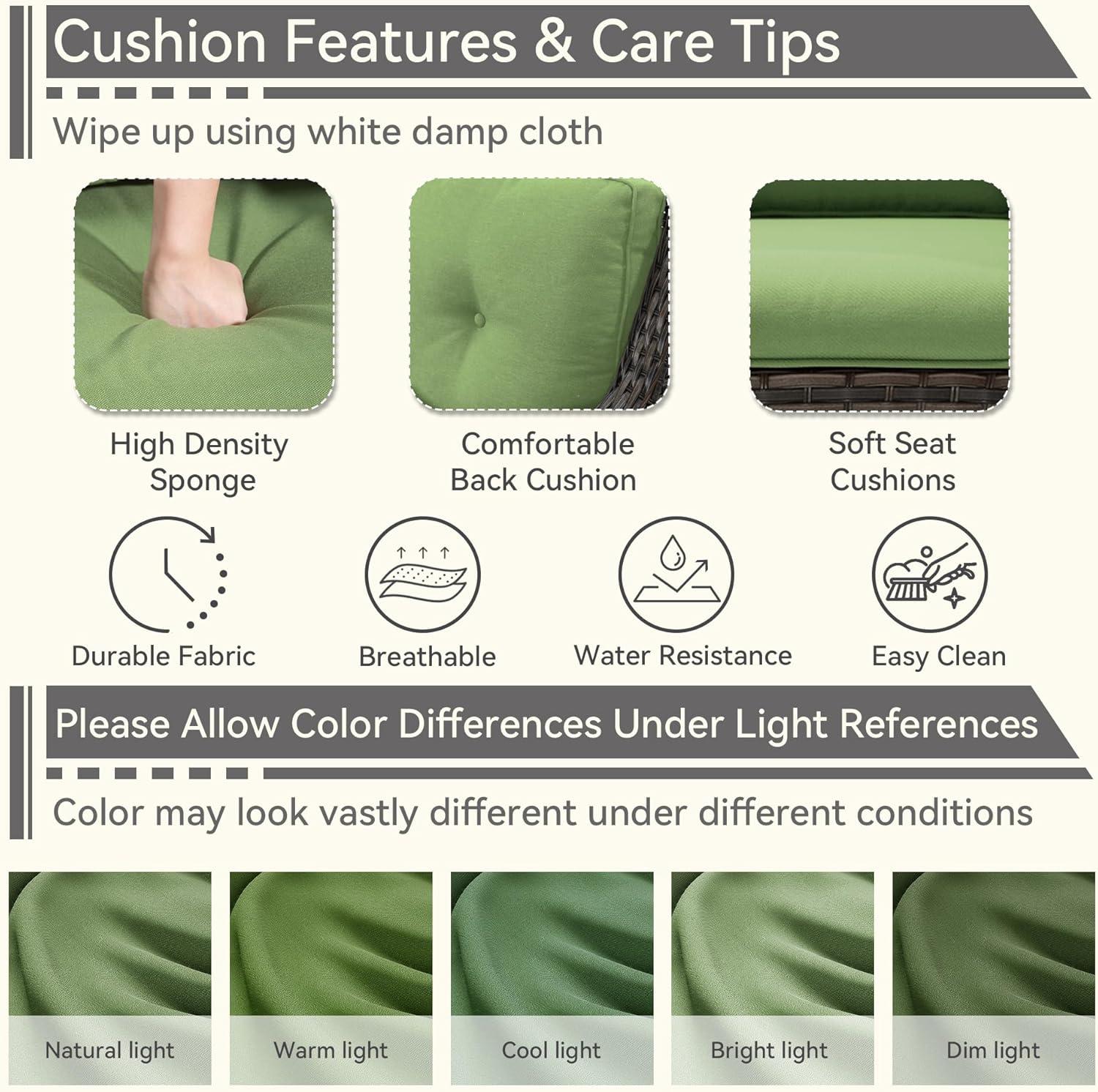 The green cushions instantly elevate both the comfort and visual appeal of this outdoor rocker.Their vibrant yet natural hue blends beautifully with the mixed brown-grey rattan, creating a refreshing, inviting ambiance that complements any porch or patio setting. not only do they add a splash of color that feels lively and soothing, but the cushions themselves are thoughtfully designed with a 3.5-inch thickness on the seat and a 7-inch thickened back cushion, providing superb lumbar support that makes long, leisurely sessions in the rocker much more comfortable. We’ve noticed that the ergonomic shape combined with the plush cushions significantly reduces fatigue, making it a perfect nook for reading, relaxing, or enjoying a sunset.