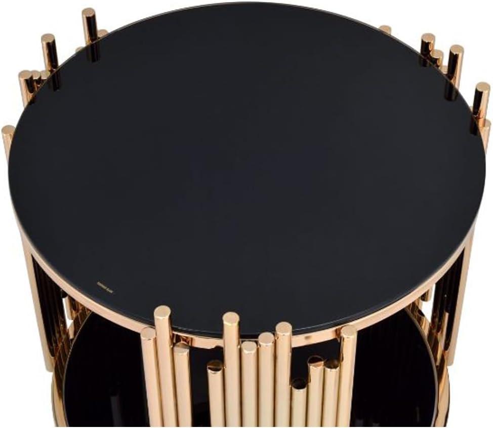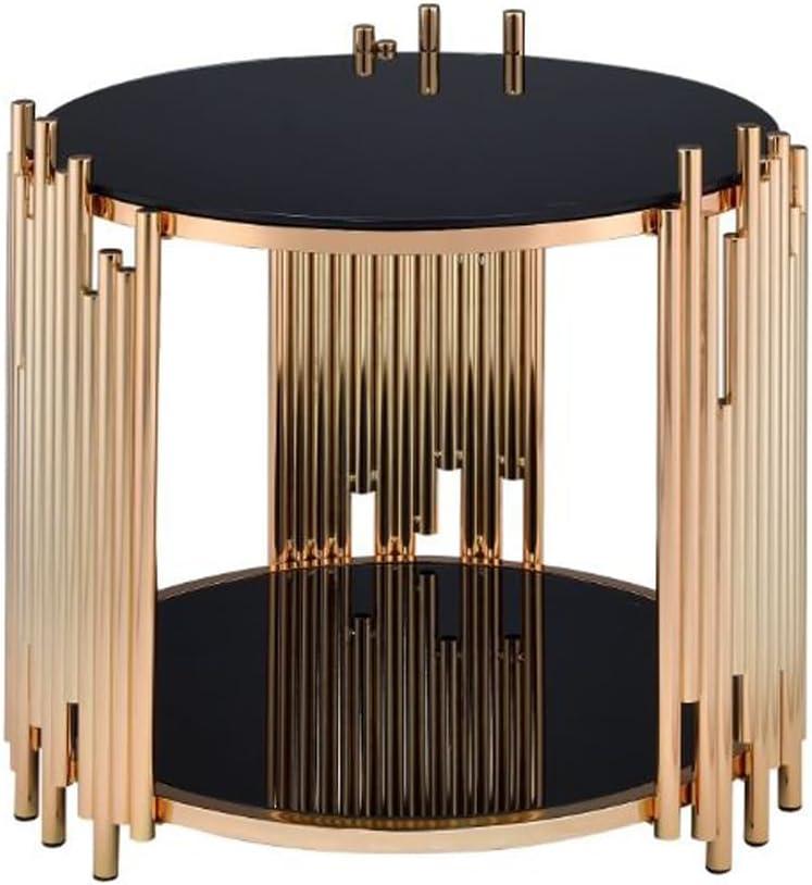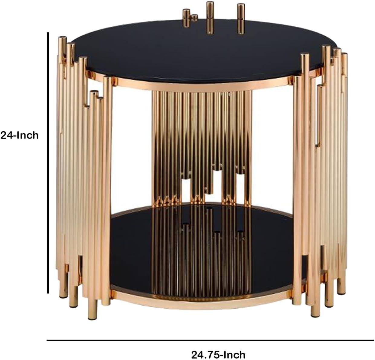 You notice the warm gleam of the gold tubing before anything else: the benjara Modern Metal and Glass End Table with Tubing design in black and gold — the “tubing table” here — settles into the room like a small, purposeful sculpture. Run a hand across the round glass top and it feels cool and secure; the open lower shelf keeps the piece from looking visually heavy. At roughly two feet tall it lines up with the sofa arm, and the asymmetrical metal tubes catch stray light as you move around the room. The black frame tones the gold down just enough that the whole thing reads as a quiet,sculptural pause rather than a shout.