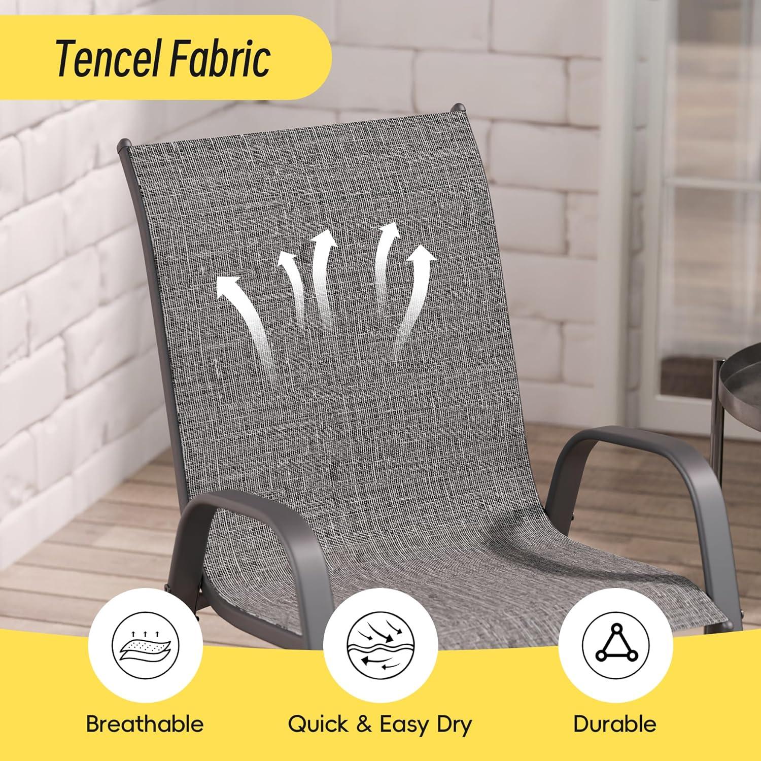 Wear and maintenance observations differ slightly from initial expectations. The finish resists obvious corrosion in short-term exposure, but scuffs and small abrasions appear where frames contact during stacking or transport.Breathable seating fabric stays comfortable in warm weather, yet it can retain evening dampness after a dewy night and shows mild surface softening after repeated tension and settling. Hardware that initially feels secure sometimes loosens after repeated moving and requires readjustment, and on irregular paving the legs may rock rather than sit perfectly flat.