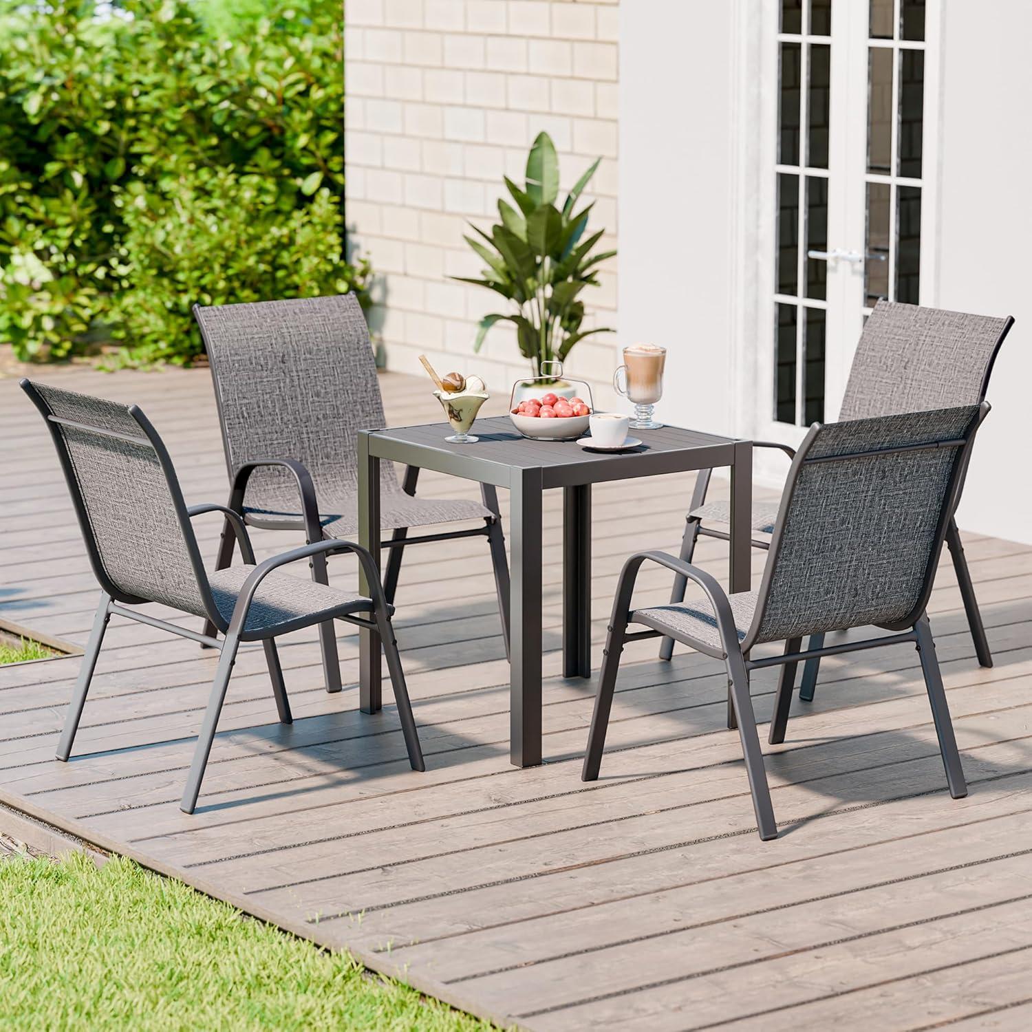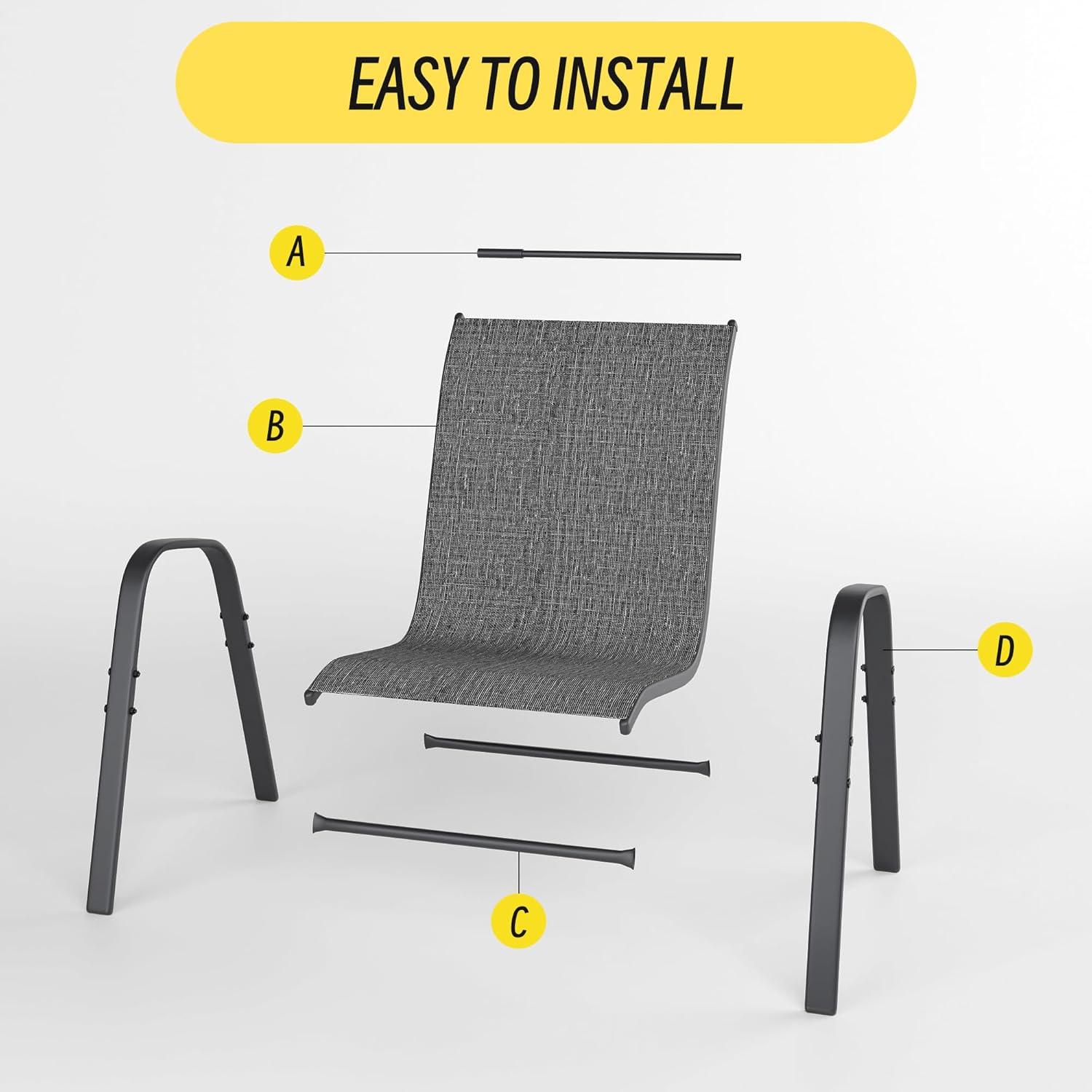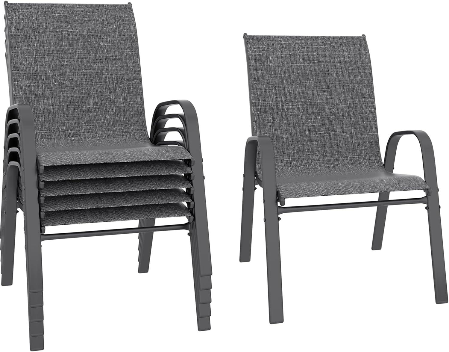 Sunlight skims teh powder-coated frame and the seat fabric gives a faint, airy rustle when you run a hand across it — the chairs feel lighter than their metal skeleton suggests. Arriving as the Betterhood patio Chairs Set of 6, they were stacked by the back door when you first unboxed them. Each chair looks a touch wider up close; the steel meets the breathable weave with a cool, utilitarian seam under your palm. Placed around the table they settle into the yard like familiar furniture, a calm repetition of thin frames and textured seats that quietly reshapes the space.