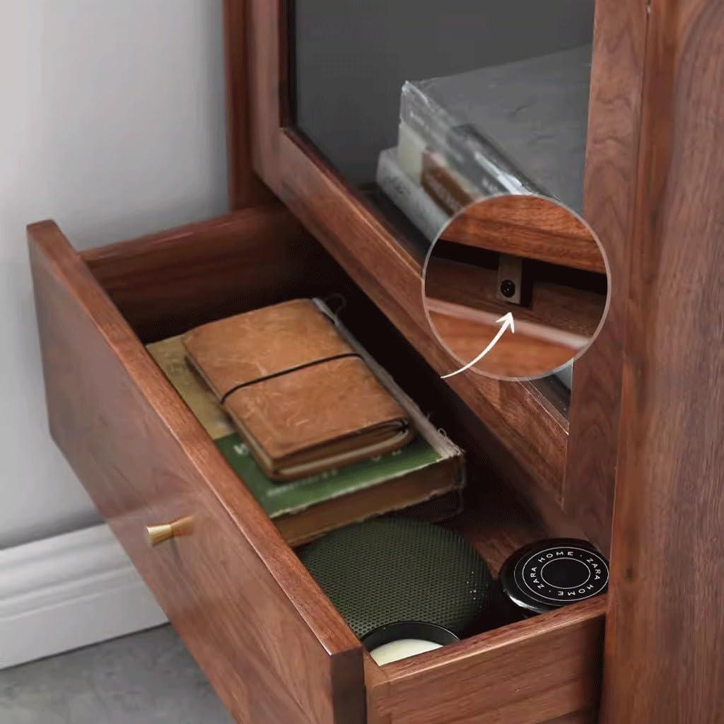 The black walnut grain shows differently depending on angle and time of day: in morning light the warmth deepens,in evening it becomes more subdued,and in mixed lighting the grain can appear almost striped. The piece’s silhouette is tall and narrow; it adds a vertical line to the room rather than spreading outward. From certain viewpoints that verticality reads as a steady, architectural presence, while from others the inset glass and visible shelving break the form into softer tiers. Small metallic accents catch the eye intermittently, punctuating the silhouette without overwhelming it.