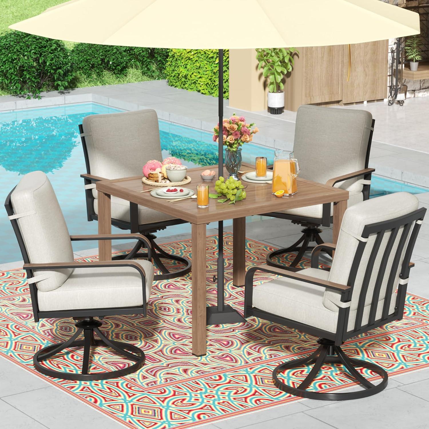 When we set this dining set up on our lawn, the all-weather frame immediately stood out. Thanks to the rust-proof electroplating and powder coating, occasional dewy mornings and sudden showers caused no worry about corrosion or rust. The wood-like finish harmonizes beautifully with grass and garden surroundings, creating a cozy but natural dining atmosphere. Plus,the 1.65-inch umbrella hole gave us the flexibility to add shade when needed, especially during radiant sunny afternoons. The swivel chairs with their gentle rocking motion were a hit, allowing us to move easily around the table while engaging in conversation or watching kids play nearby.
