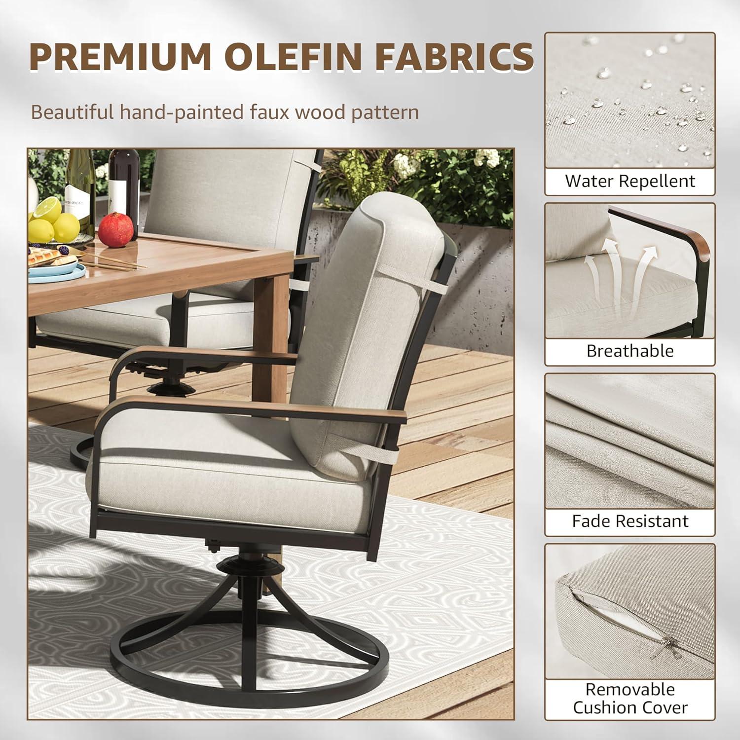 Comfort and functionality are central to the design. Each chair features a 360-degree swivel and a gentle 15-degree rocking motion, encouraging relaxed conversations during meals. The ergonomic seats come filled with high-density foam cushions that are both waterproof and UV-resistant, wrapped in removable, washable polyethylene covers for easy upkeep. Metal panels built into the frame support up to 350 pounds, ensuring exceptional stability and safety. The spacious dimensions and solid construction make the set a reliable choice for outdoor dining.