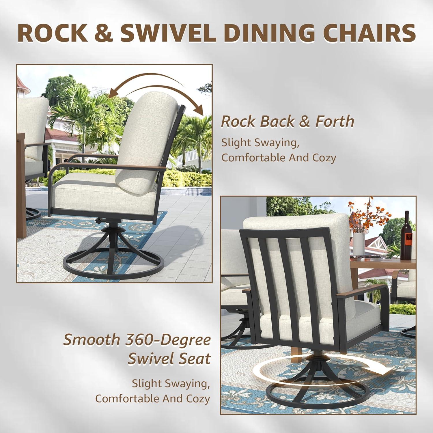 After spending considerable time with this outdoor dining set,we’re genuinely impressed by its blend of style,durability,and comfort. the ergonomic design with high-density foam cushions wrapped in waterproof, UV-resistant covers ensures that seating remains cozy and practical through changing weather conditions. Plus, the 360-degree swivel and gentle rocking functions add a subtle yet meaningful touch of relaxation and conversation-friendly movement that elevates the overall outdoor dining experience. The handcrafted wood-like finish on both the table and chairs offers a natural elegance that harmonizes perfectly with garden and deck settings while the rust-proof, powder-coated steel frame promises longevity even in unpredictable climates.