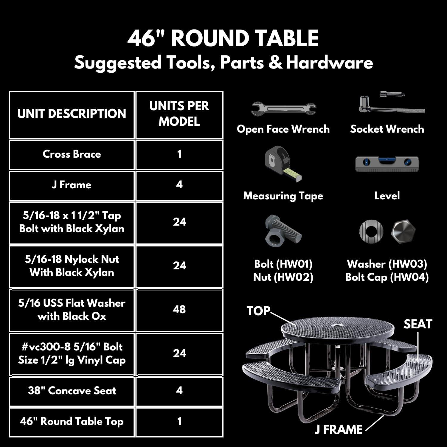When you open the carton,you’ll notice significant steel pieces wrapped in protective plastic and a smaller envelope with fasteners and fittings. Parts sit bulky and flat; the round top feels rigid while the leg/frame sections are dense and awkward to pivot alone. Hardware typically arrives bagged and labeled, and you’ll find a mix of carriage bolts, hex nuts, lock washers and a few short self-tapping screws. An Allen key or wrench is often included, though you’ll reach for a socket or ratchet at times because hand-tightening can leave bolts feeling under-seated. As you loosely assemble, the holes can be a hair misaligned — nudging one piece while another rests on a bolt is a familiar, repetitive motion that helps coax things into place.
