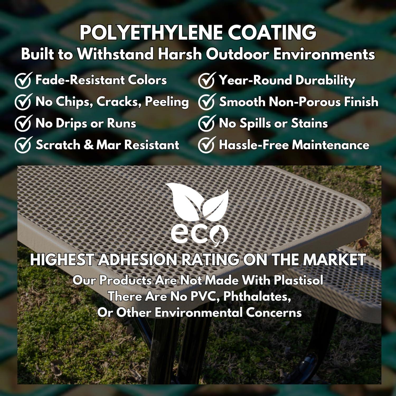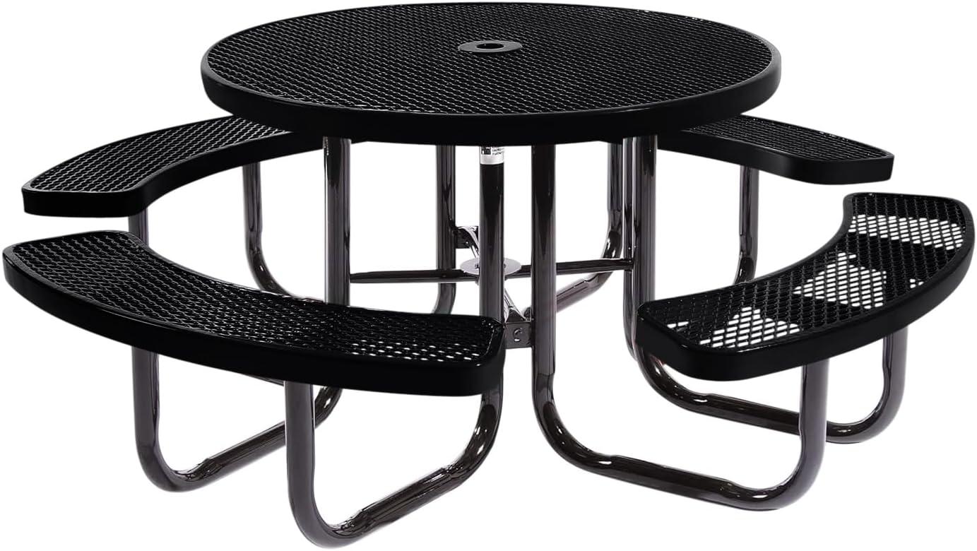 You step onto the patio and the table registers as a weighty, honest piece rather than a decorative accent.It’s the Coated Outdoor 46‑inch round picnic table—listed as the COATEDOUTDOORFURNITURE Heavy‑Duty Portable Outdoor Picnic Table with Umbrella Hole—and the expanded‑metal top catches and scatters the late light. When you run your hand along the rim the polyethylene coating feels thick and slightly textured, and the punched steel under your palm is cool and reassuring.Up close the umbrella hole and heavy welds read like purposeful construction,the black finish lending a quite,industrial presence to the space.