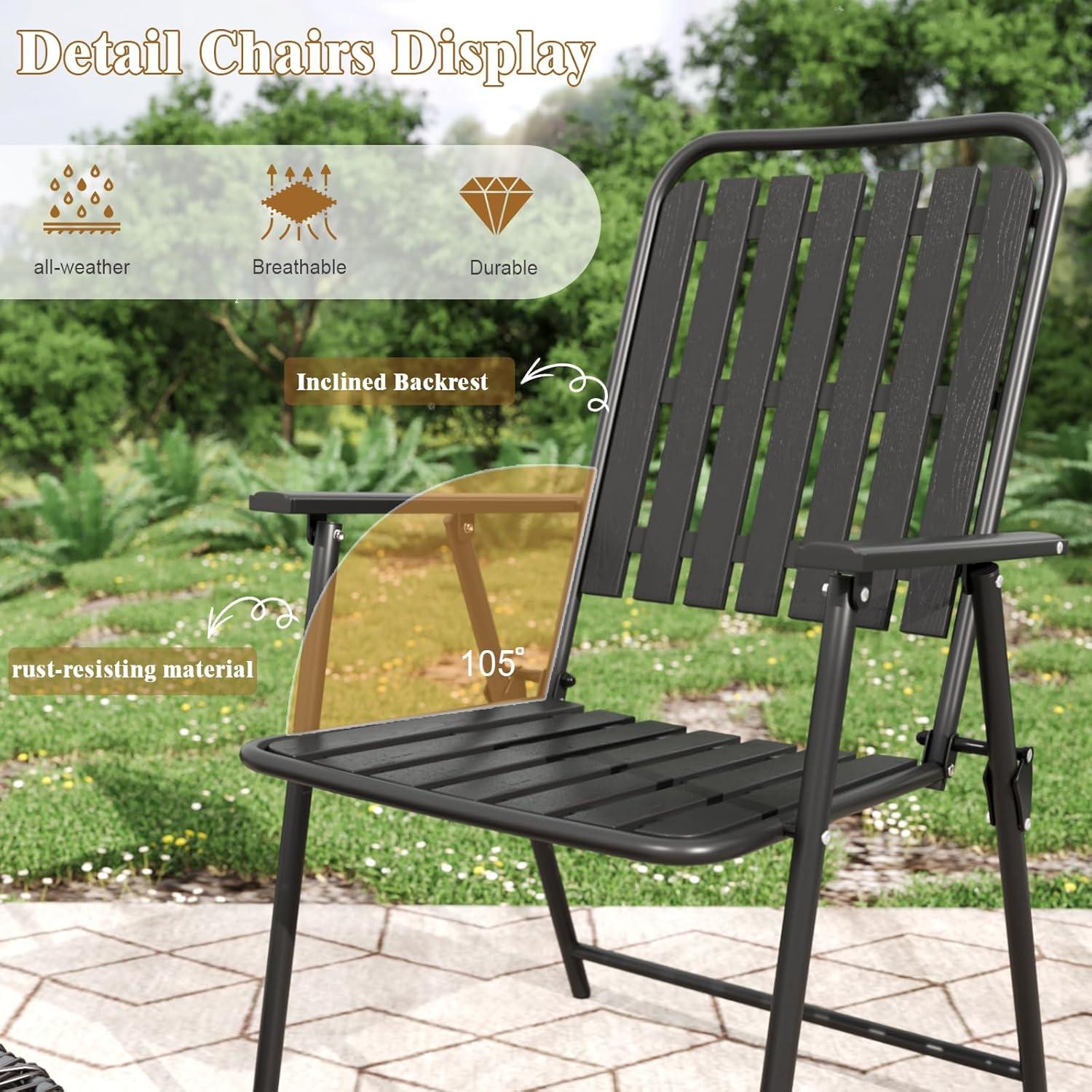 From the moment we unfolded the chairs, the thoughtful design was immediately apparent. The ergonomic WPC slats provide not only a striking modern look but also promote airflow to keep seating comfortable even on warm days. Unlike traditional wicker, these slats are both more durable and easier to maintain, which means no worries about weather-related wear or fading. The powder-coated iron frame adds a sleek contrast in black while ensuring robust resistance against rust and UV damage, making it perfect for long-lasting outdoor use. The attention to detail in blending comfort with durability truly sets this set apart.