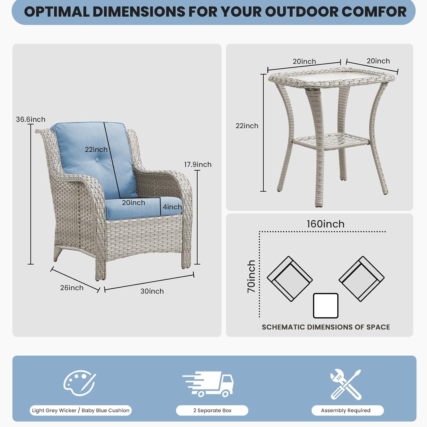 Right out of the box, the set showcases a blend of functionality and style that fits seamlessly into any outdoor space. The hand-woven light gray wicker has an understated, modern appeal, while the baby blue cushions add a subtle pop of color without being overwhelming. Each chair feels sturdy yet comfortable, thanks to the ergonomic design featuring a gentle 15-degree back tilt and armrests thoughtfully contoured to cradle our arms. The powder-coated steel frame beneath the wicker ensures enhanced durability, making these chairs suitable for everyday use. Plus, the cushions are coated with a special waterproof and sun-resistant layer, which gives us confidence they’ll hold up well through different weather conditions.