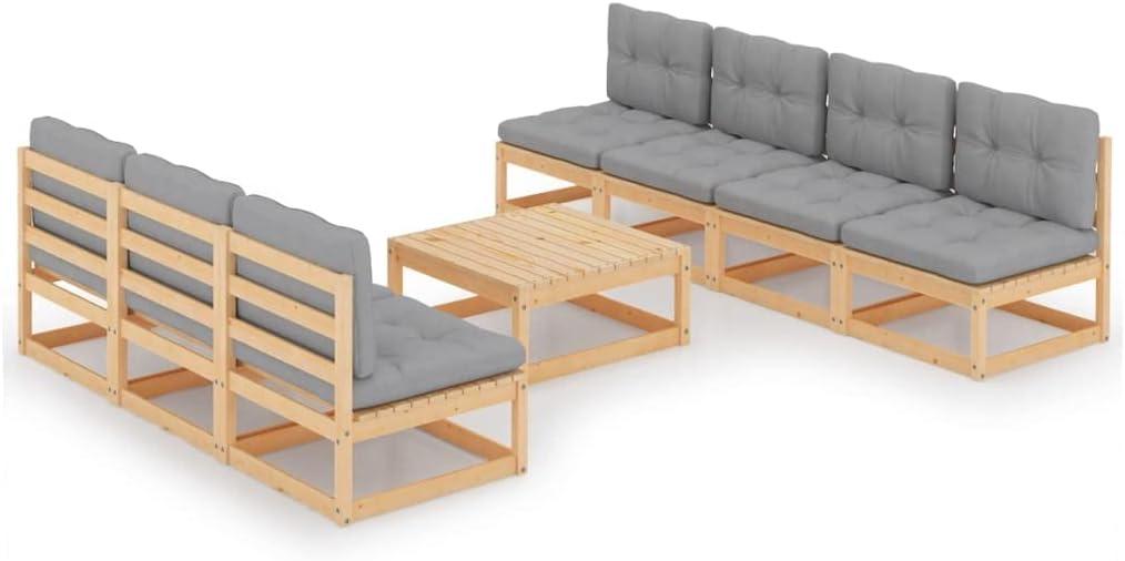 This patio lounge set impresses with its solid pinewood construction, delivering robust stability and longevity for outdoor enjoyment. The untreated wood offers a natural aesthetic, perfectly complemented by the soft gray cushions fashioned from 100% polyester fabric.Together, they provide a cozy environment ideal for lounging, casual conversations, or even a swift afternoon nap. Its modular design stands out, allowing us to rearrange the seven middle sofa pieces and table into multiple configurations that suit various patio layouts and social occasions.