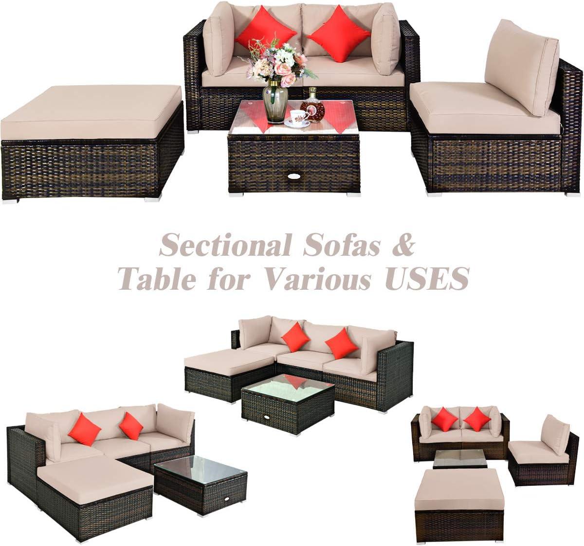 After spending considerable time with this outdoor rattan set, we appreciate its blend of durability and versatility. The sturdy steel frame combined with fade-resistant, waterproof PE rattan gives us confidence that it will withstand various weather conditions while maintaining its elegant appearance. Its sectional design offers flexibility, allowing us to reconfigure the arrangement to fit different spaces or occasions effortlessly. The ability to convert the coffee table into an ottoman by simply removing the tempered glass top adds a nice touch of multifunctionality that enhances the overall user experience.