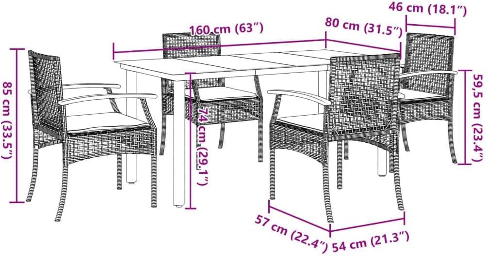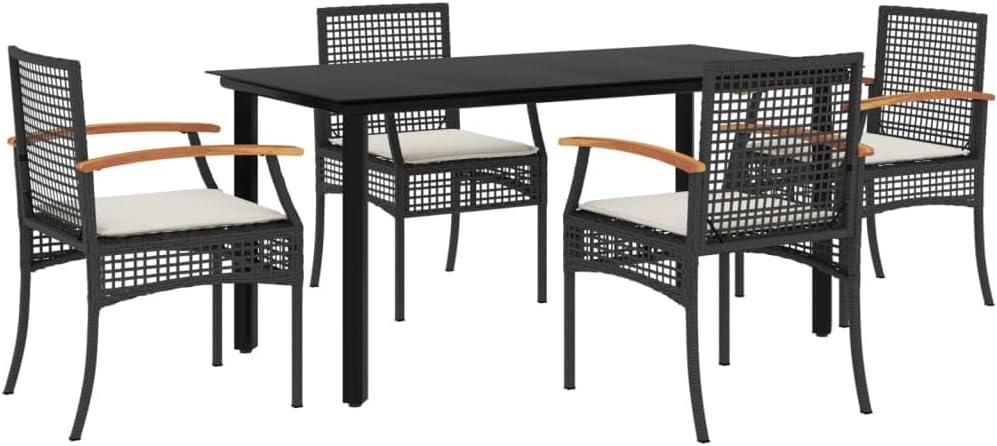 Designed with both style and convenience in mind, this outdoor dining set offers an ideal solution for enhancing our terrace or backyard experience. The compact yet spacious arrangement comfortably accommodates five people, making it perfect for intimate dinners or casual gatherings. Its sturdy poly rattan construction not only provides durability against unpredictable weather but also requires minimal maintenance, allowing us to spend more time enjoying the outdoors and less on upkeep. The chairs feature plush cushions that balance comfort with easy-clean fabric, making every meal relaxing without worrying about spills or stains.