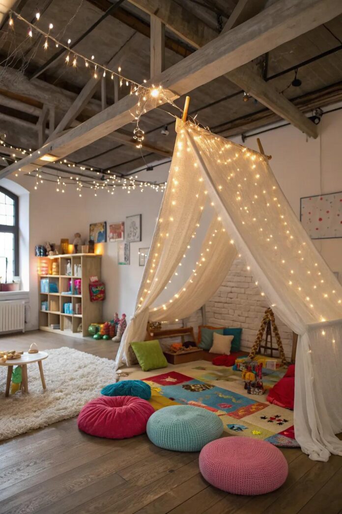 Adorn the ceiling with a string light canopy to infuse the playroom with a dreamy ambiance. These gentle lights craft an enchanting atmosphere that children find utterly mesmerizing.