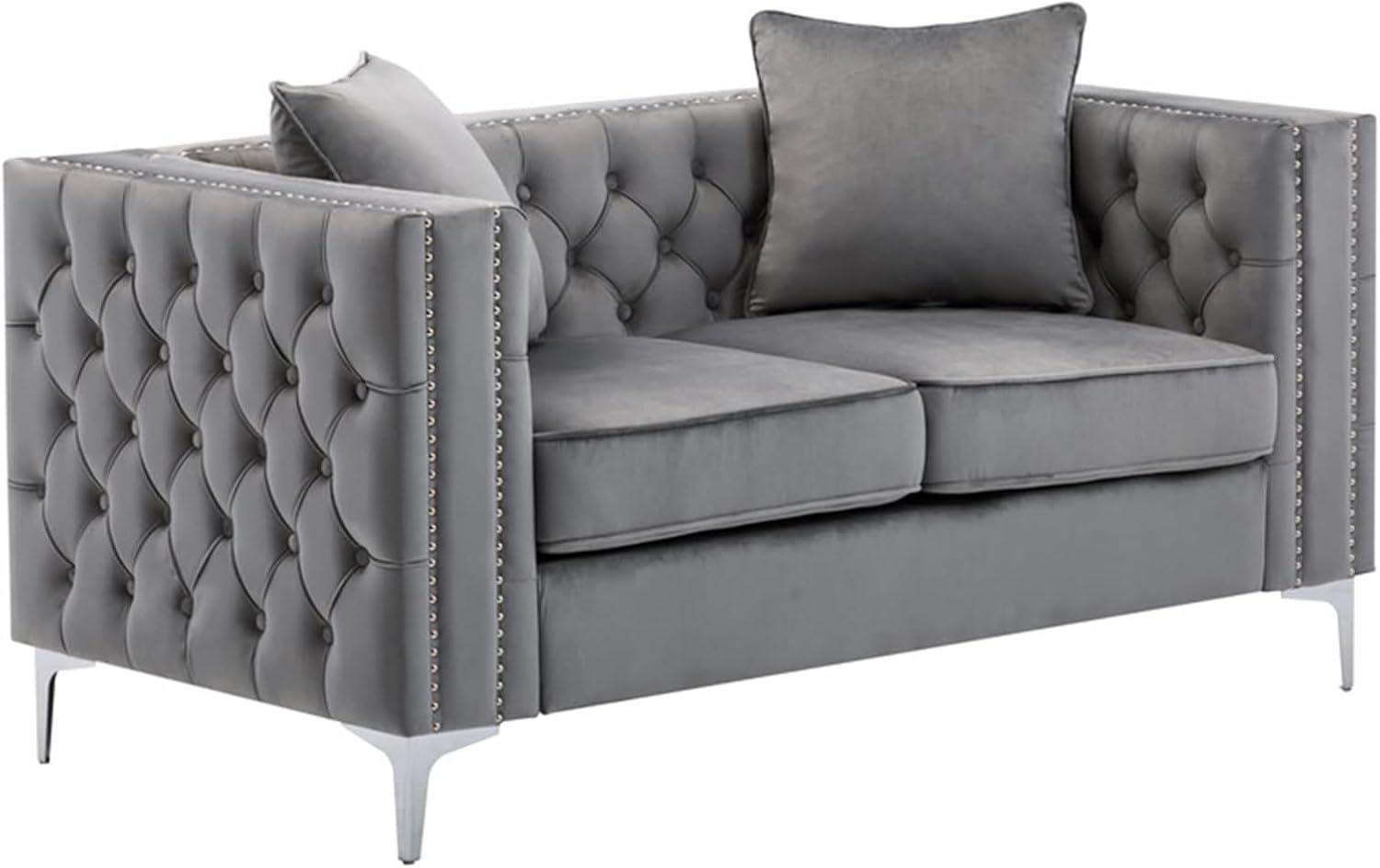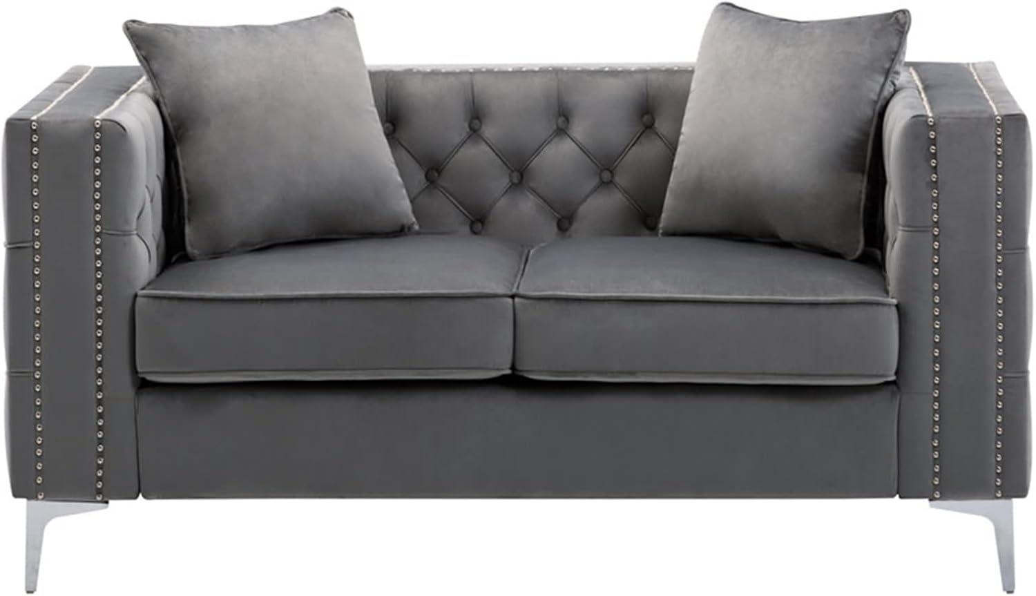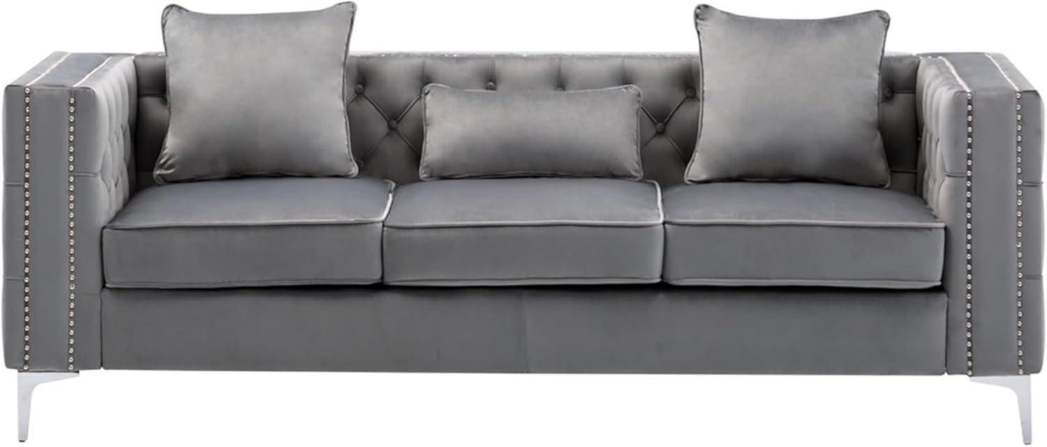 In bright, natural light you’ll notice the grey velvet picks up a subtle sheen — the nap lays in places and against seams it can read a touch lighter, almost silvery.As you move around the set or smooth a cushion, small shifts in pile create a patchwork of tones across the seat and back; fingers brushing the fabric often leave faint tracks until the pile settles again. The tufting and nail-head trim catch highlights differently than the flat panels, so the ornamental edges tend to read a little brighter than the recessed areas.