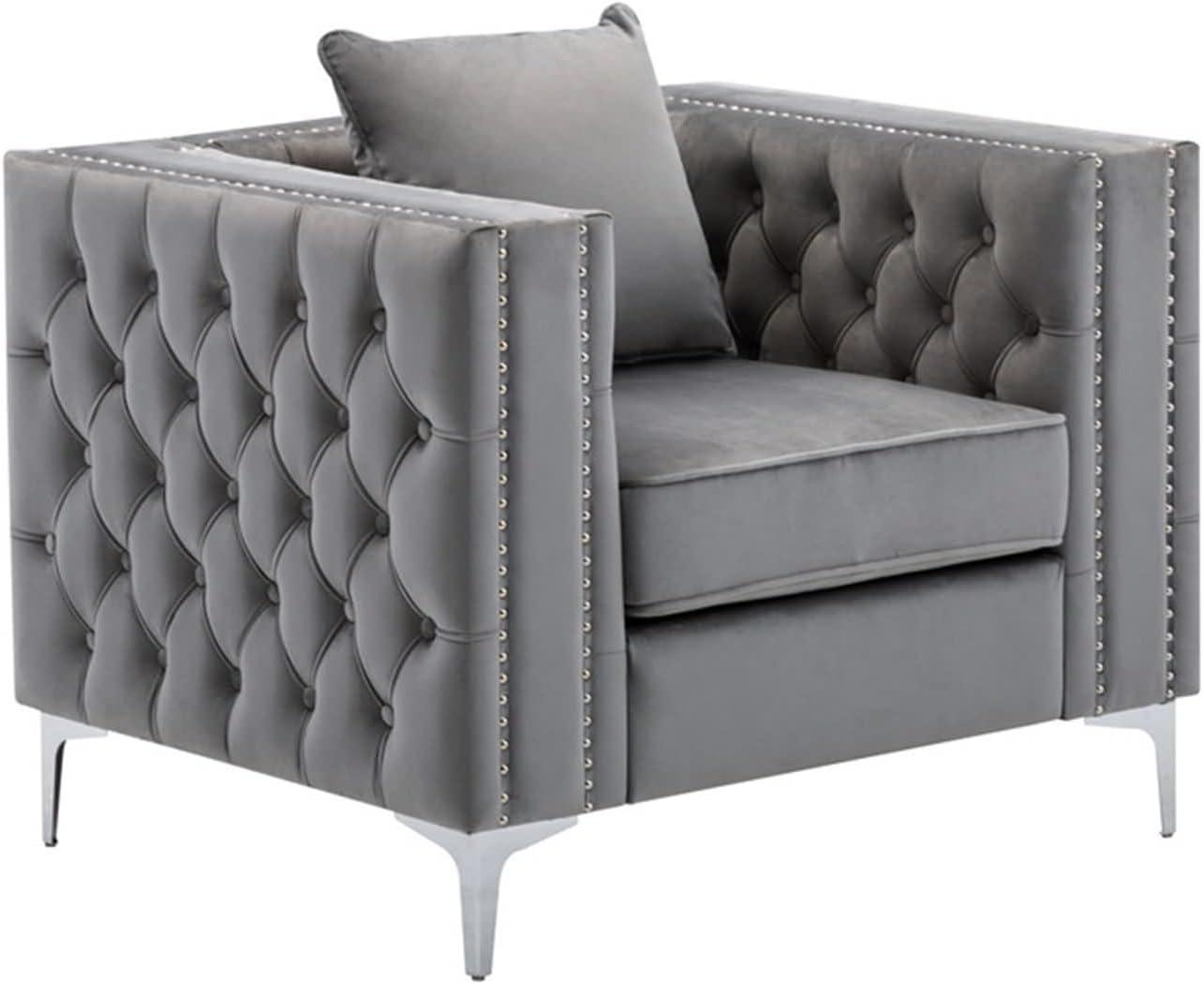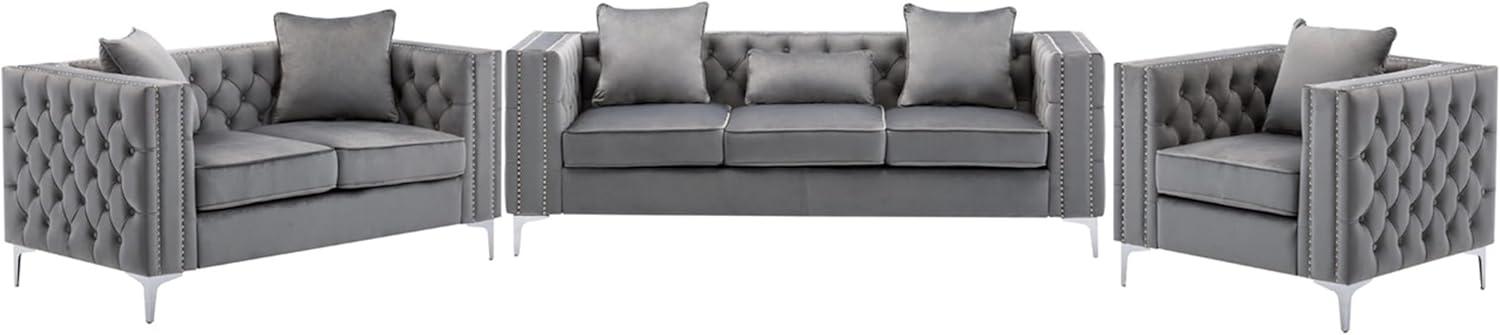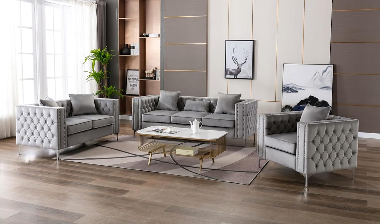 You notice the velvet first — a cool, slightly crushed grey that catches the light adn smooths the room’s edges. The Daesar 3 Piece Couch Sets — a sofa,loveseat and chair — settles in with a low,horizontal profile that reads more like a conversation area than a stage piece. Button tufting and the double nail-head trim show up as small, purposeful details; under your hand the back feels firm and the seats give just enough to settle into.Chrome legs lift the visual weight slightly, so despite the set’s presence the space still breathes. Brush past an armrest and the texture, scale and quiet heft of the set register all at once.