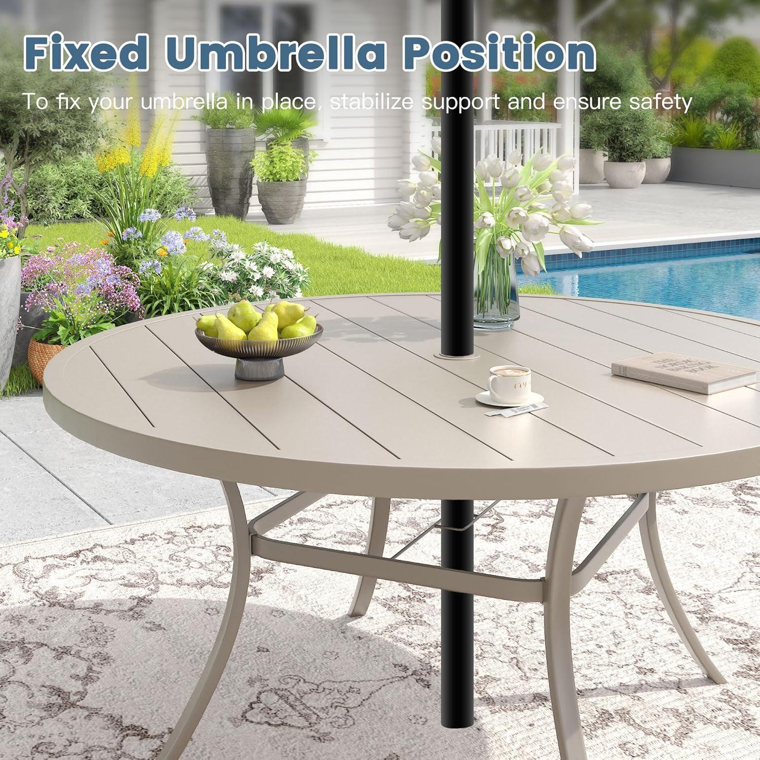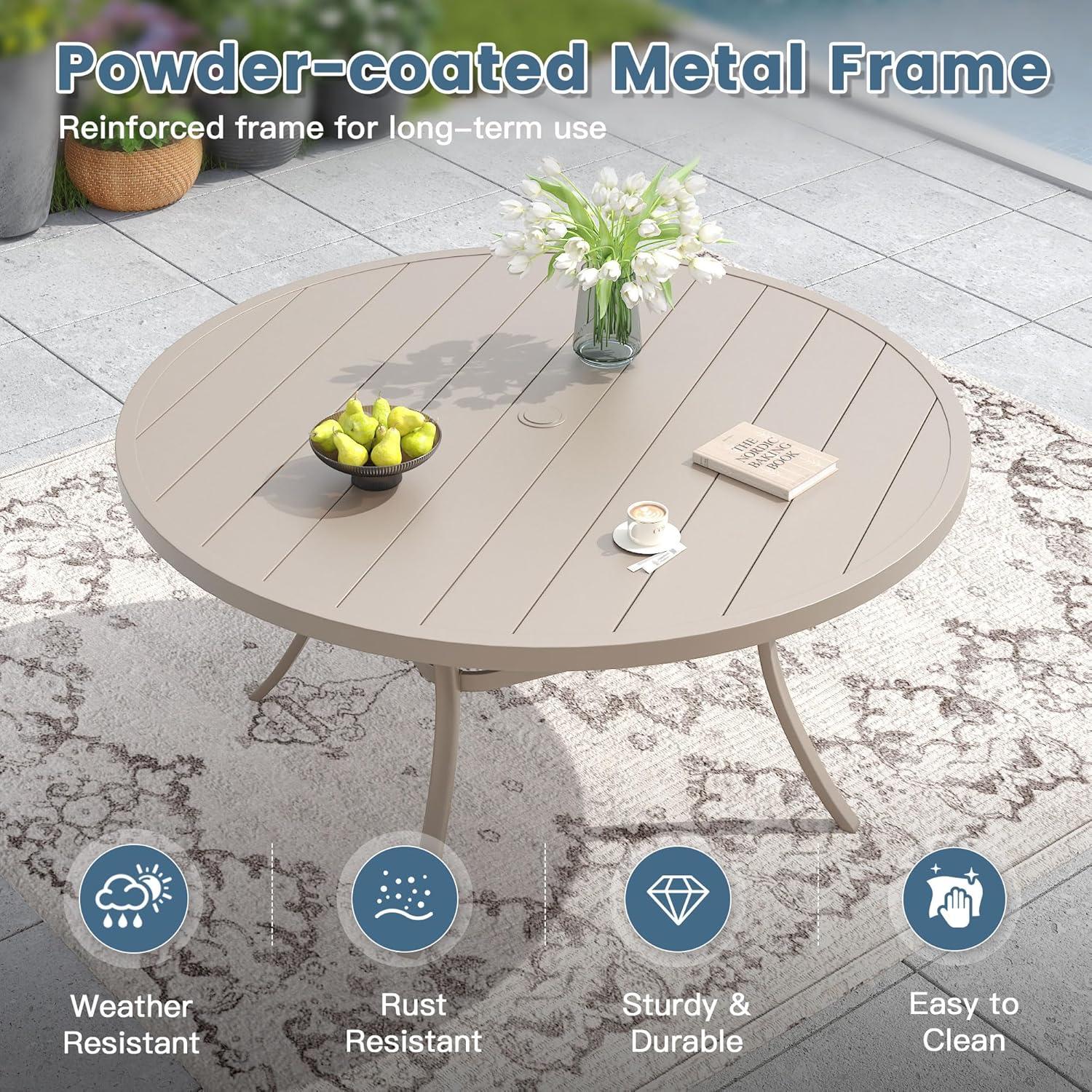 The round metal dining table offers a spacious 60-inch diameter surface, comfortably accommodating 8 to 10 people, making it perfect for large gatherings or family dinners outdoors.Its adjustable umbrella hole (ranging from 1.57″ to 1.9″) adds versatility,allowing us to block out harsh sun rays or light rain with ease. The hand-polished tabletop exudes a modern yet timeless elegance, blending seamlessly into any patio setting. Built with a sturdy metal frame and enhanced by a premium anti-rust powder e-coating,the table withstands the elements without requiring special maintenance. We found the surface easy to clean, and the overall structure impresses with its durability and weight capacity of up to 250 lbs.