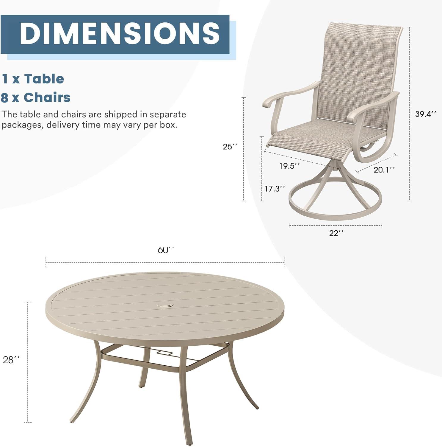 This dining set’s versatile design makes it a natural fit for a wide range of outdoor environments, from cozy balconies to spacious backyard patios. The 60-inch round table comfortably seats 8 to 10 people,making it ideal for both intimate family dinners and larger social gatherings. Its neutral sandshell color blends seamlessly with various décor styles, adding an elegant yet understated charm. Whether nestled under a pergola or placed in an open garden area, the table’s umbrella hole accommodates an umbrella effortlessly, providing shade and enhancing usability on sunny or rainy days.