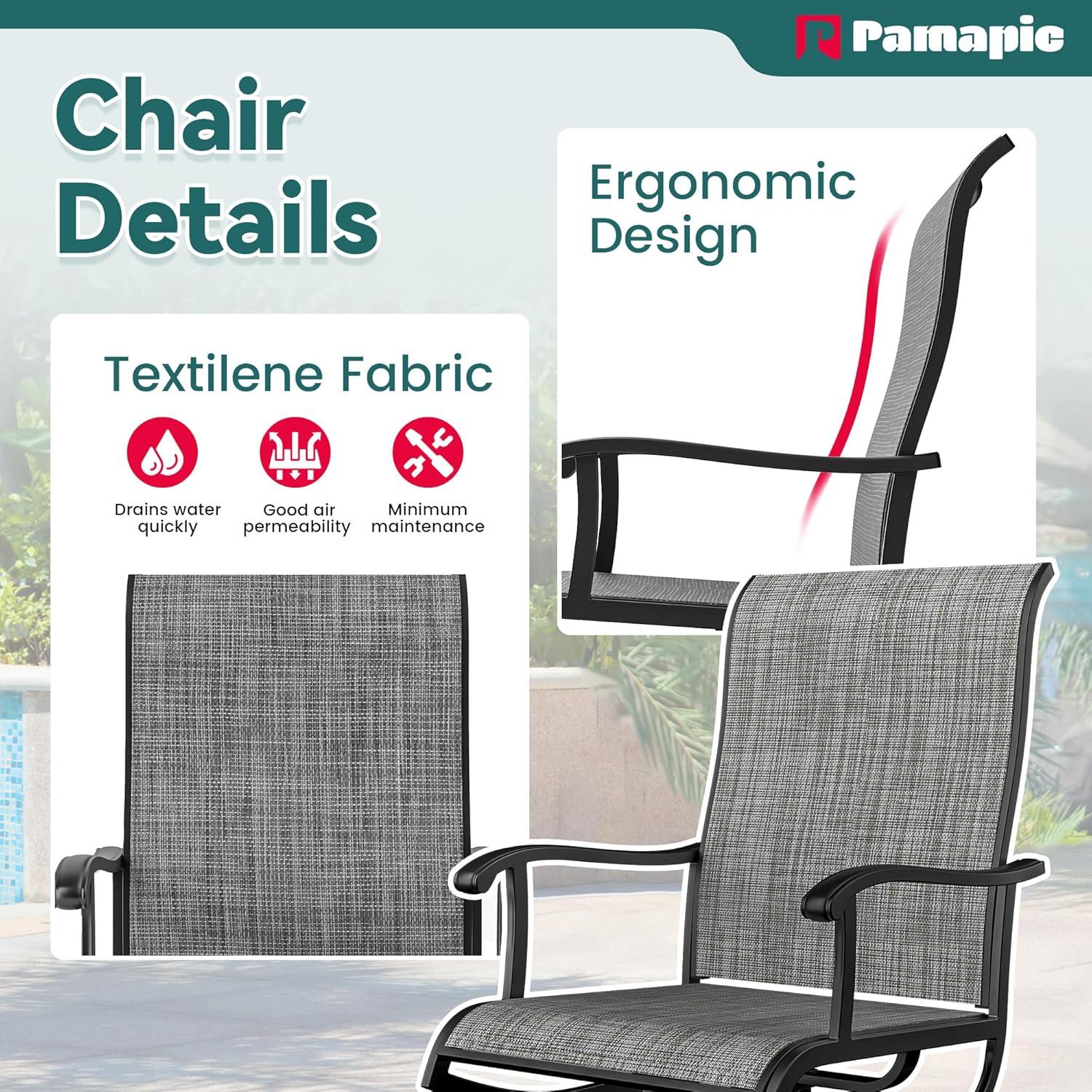 The swivel chairs excel in delivering a unique blend of comfort and practicality.Featuring a 360° swivel combined with a gentle 10° rocking motion, they provide a relaxing seating experience that encourages long, leisurely conversations or quiet moments outdoors. The high-back ergonomic design gives solid support to the back and shoulders, making these chairs suitable for various body types and ideal for dining or casual lounging. The breathable and fade-resistant Textilene fabric ensures that the chairs remain cool and pleasant to the touch, even on hot days, while its quick-drying characteristic guarantees comfort regardless of sudden rain showers. This means you can enjoy your outdoor space without worrying about moisture or lingering dampness.