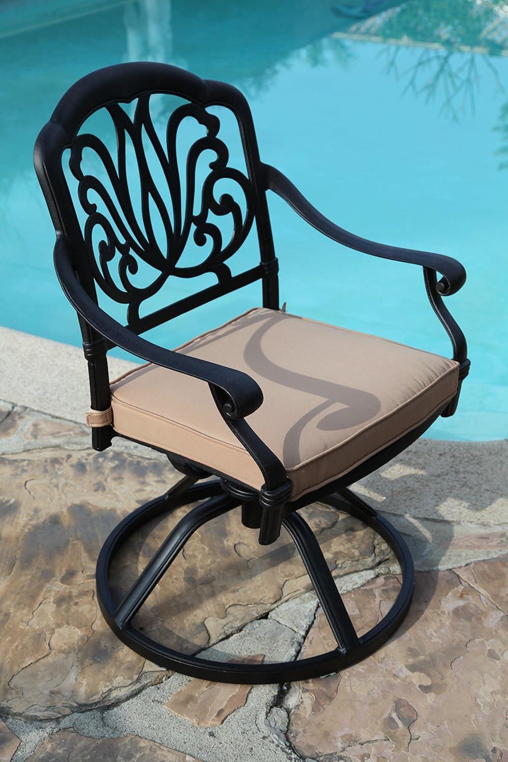 The swivel rockers in this dining set really stand out for their blend of comfort and practicality. Each chair features a smooth swivel motion combined with a gentle rocking function, allowing us to easily adjust our seating angle without having to get up. Despite being made of cast aluminum,the chairs feel surprisingly lightweight at 25 lbs each,and they maintain a sturdy presence thanks to the powder-coated antique black brown finish. We found the seats comfortable even without cushions, providing excellent back support with a design that encourages relaxing conversations around the table.