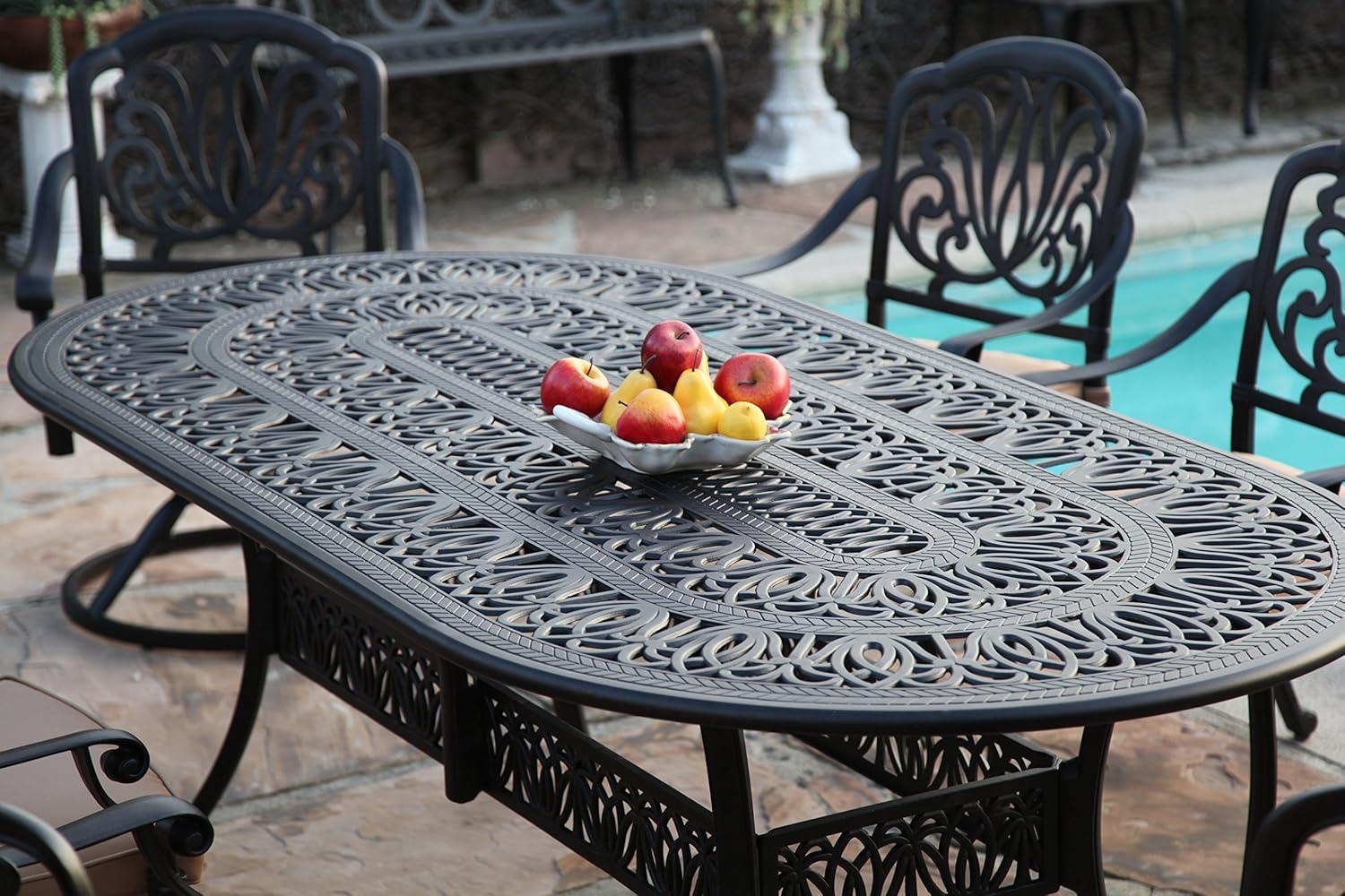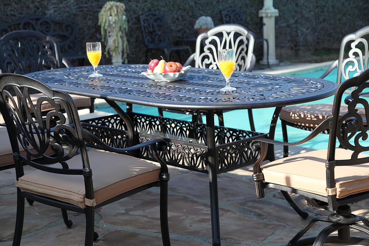 After spending time with this outdoor dining ensemble, we appreciate its combination of style and durability. The cast aluminum construction with a powder-coated finish ensures longevity and resistance to the elements, while the antique black brown color adds a timeless elegance to any patio setting. The six swivel rocker chairs enhance comfort and social interaction, making gatherings more relaxing and enjoyable. Though some assembly is required on the table legs and swivel bases, the chairs come ready to use, easing the setup process overall. However, buyers not comfortable with DIY assembly might find the instructions less than clear, so planning ahead is advisable.