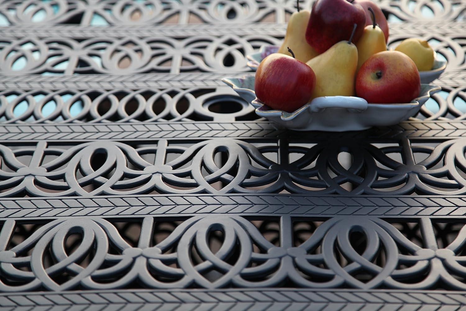 We promptly noticed the antique black brown powder-coated finish that gives this set a timeless and elegant look, perfectly blending classic charm with modern durability. the cast aluminum frame not only looks remarkable but feels incredibly sturdy - ensuring resistance to rust and weather over time. Each chair weighs a solid 25 lbs, offering both stability and easy maneuverability, while the 85-inch-long table provides ample space for gatherings without feeling overcrowded. The powder-coated surface is smooth to the touch and adds a subtle sophistication that enhances any outdoor environment.