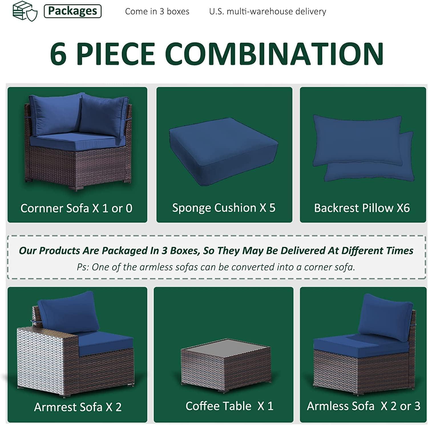 | Complete set: Includes a coffee table and six seating pieces, perfect for entertaining friends and family. | Clip Usage: Plastic seat clips work well, but if lost, replacements could be hard to find, possibly affecting sectional stability. |