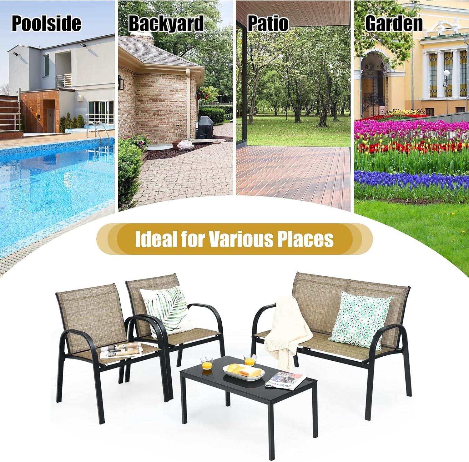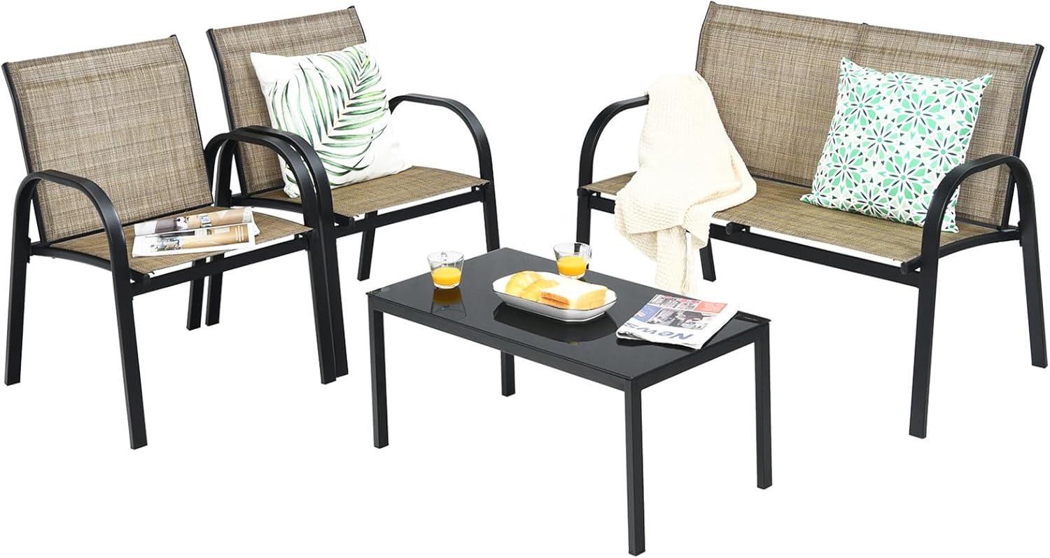 Transforming our outdoor area was effortless with this sleek four-piece set, which brings a touch of modern elegance without overwhelming the natural beauty of our garden. The rich brown hues blend harmoniously with greenery, while the minimalist steel frame design offers a contemporary appeal.The combination of a loveseat, two single sofas, and a glass-top coffee table creates a balanced and inviting atmosphere that’s perfect for casual conversations or quiet relaxation. Each piece complements the other, showcasing clean lines and subtle curves that enhance the visual flow rather than disrupt it.