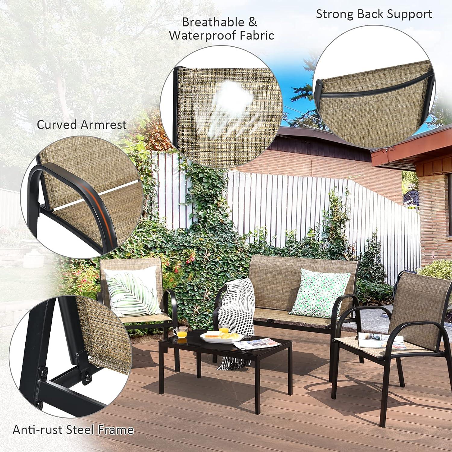 | Comes as a complete 4-piece set-loveseat, two chairs, and table-ready to furnish your spot | Fabric material on sofas may require careful maintenance to withstand outdoor weather |