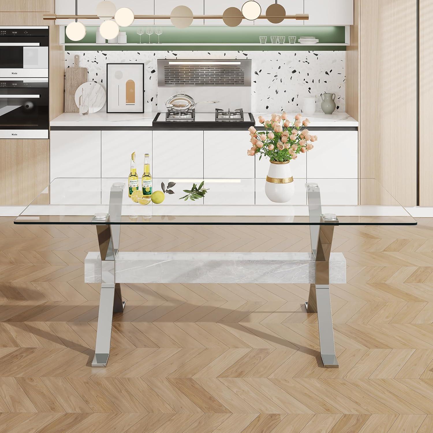 As we explored the sleek design of this Rectangular Dining Table, a few clear advantages caught our attention.The tempered glass tabletop not only adds a elegant touch but also ensures durability and easy cleaning, making it ideal for everyday dining or office use. The metal tubular legs provide solid stability while the marble-colored MDF crossbars add an elegant contrast,enhancing the overall aesthetic without overpowering the space.