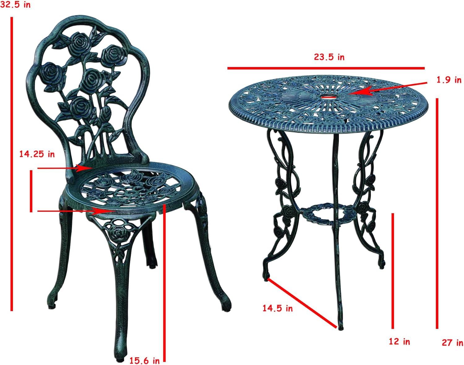 Our outdoor space truly comes alive with this charming bistro set, which combines elegant floral motifs and a vintage-inspired antique green finish.the delicate rose design woven into the cast aluminum adds a subtle yet distinctive artistic touch that elevates the ambiance without overwhelming the surroundings. We appreciate how the compact yet thoughtfully proportioned dimensions of the table and chairs fit perfectly into smaller nooks or cozy garden patios, making the space inviting and intimate for relaxing or casual conversation.