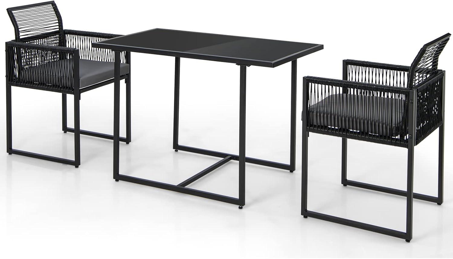 Upon first glance, this 3-piece outdoor dining set instantly impresses with its sleek blend of black PE rattan and sturdy metal framing. The hand-woven rattan not only elevates the aesthetic to a refined yet casual elegance but also promises durable performance against weather challenges. Each chair features a contoured backrest designed to provide lasting comfort, complemented by cushions filled with high-density elastic foam and equipped with removable, zippered covers for easy maintenance.What stands out is the thoughtfulness behind the space-saving design: after use, folding the chair backs and sliding them under the table creates a neat, compact footprint - an ideal solution for patios, balconies, or poolside nooks with limited space.