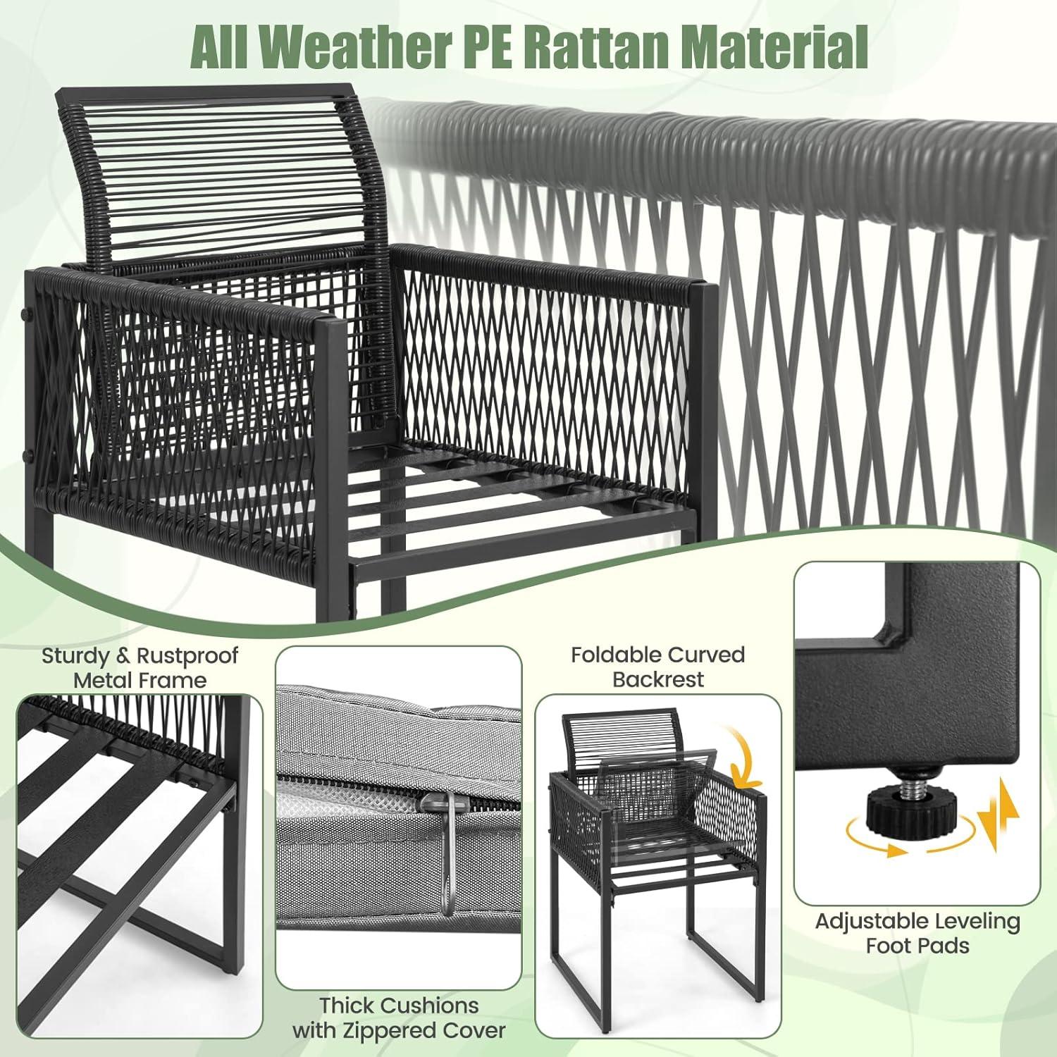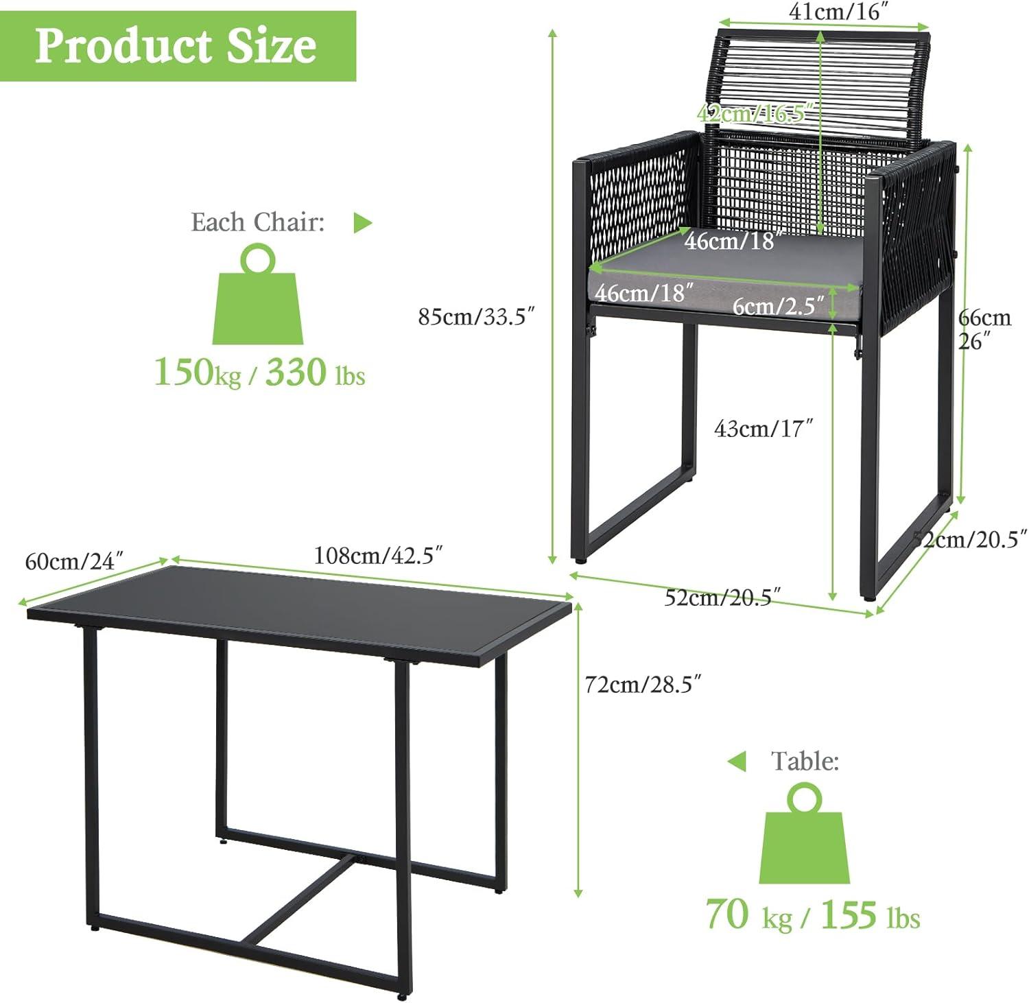Crafted with a blend of thoughtful design and durability, this outdoor set delivers much more than just style. The hand-woven black PE rattan offers an elegant, contemporary look while promising impressive resistance to the wear and tear caused by weather exposure. The robust metal frames act as a solid backbone for each piece, enhancing stability and longevity. Adjustable footpads help keep the furniture perfectly balanced,even on uneven surfaces – a real bonus for outdoor spaces that aren’t perfectly flat.We also appreciate the space-saving innovation; folding chair backs and cushions slide effortlessly under the tempered glass table, making it ideal for smaller balconies or patios without compromising on comfort or function.
