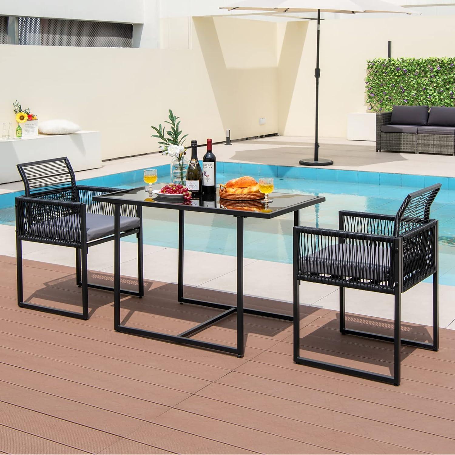 From our experience, this compact 3-piece patio set strikes a harmonious balance between style, comfort, and practicality. Its durable frame combined with hand-woven PE rattan offers both a refined aesthetic and long-lasting performance, ideal for withstanding various outdoor conditions. The thoughtfully designed cushions and contoured chair backs make sitting out for extended periods a genuinely comfortable affair. Plus, the tempered glass tabletop adds a sleek touch while being incredibly easy to clean, rounding off a sophisticated yet functional dining experience.
