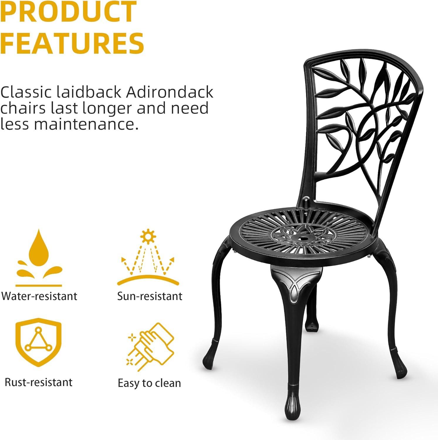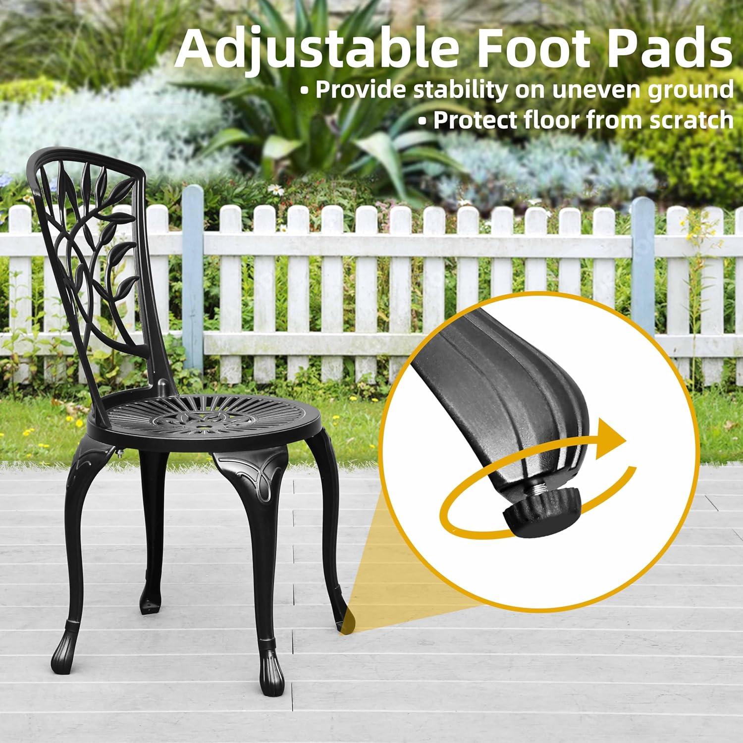 Across spring into early fall you’ll find routine upkeep settles into a few small rituals rather than a chore. Leaves and pollen collect in the cast pattern and in the table’s umbrella hole; a quick wipe and a flick of a hand usually clears most of it. You shift chairs more than you think — nudging them level on uneven pavers, sliding one back to make room, or tucking them close under the table — and those small movements leave faint scuffs along lower edges where contact is frequent. After rain, water beads on the surface and pools briefly in recesses of the table top; mornings bring a thin film of dew that you brush away before using the set. The adjustable feet get turned now and then to compensate for settling ground, and the metal surfaces feel notably cooler to the touch after a cloudy night.