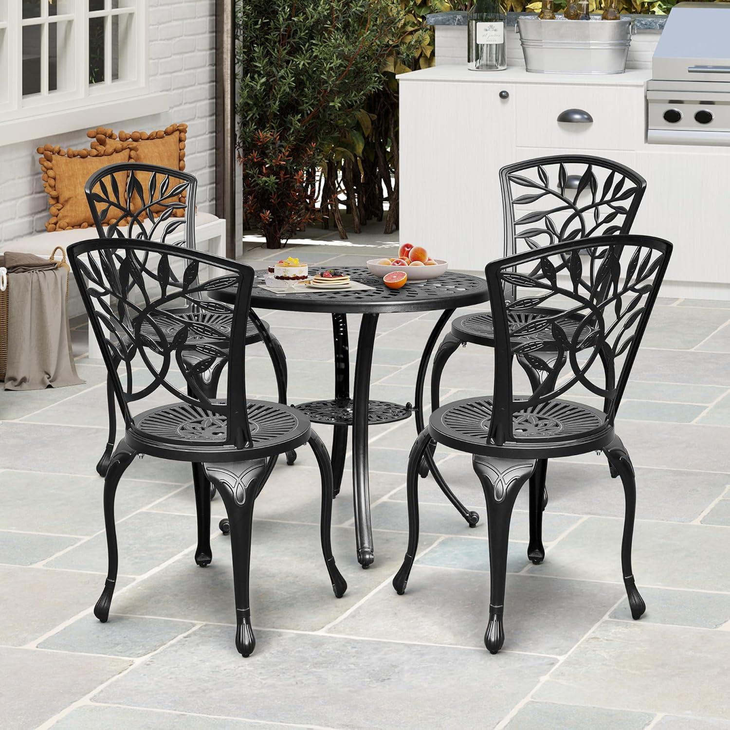 Living with it over time you notice how the DWVO 5 Piece Outdoor Cast Aluminum Patio Dining Sets with 4 Chairs, 30 Inches Round Table with umbrella Hole, All-Weather Patio Conversation Sets with Adjustable Feet for Balcony Backyard Garden quietly takes its place along the edge of the balcony, steady rather than calling attention. In daily routines the chairs develop a familiar lean and the table’s surface gathers small marks and a soft, lived-in sheen as cups and plates pass through the day. As the room is used,paths adjust and cushions shift to the contours of habit,folding the piece into regular household rhythms. Over weeks it simply rests and becomes part of the room.