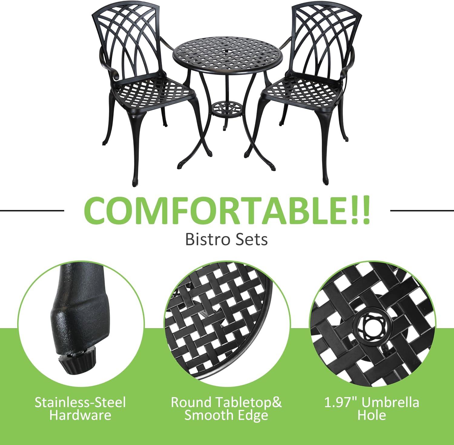 The design blends both style and functionality seamlessly. The smooth, powder-coated black finish is rustproof and weather-resistant, maintaining its elegant look across sun, rain, or snow. The table features a 1.97-inch umbrella hole that fits most parasols, providing essential shade and protection from UV rays or unexpected showers. Its dimensions (24″ diameter x 26″ height) create an intimate setting perfect for casual meals or coffee breaks.Below is a quick overview of the key design specs that make this set ideal for any outdoor setting:
