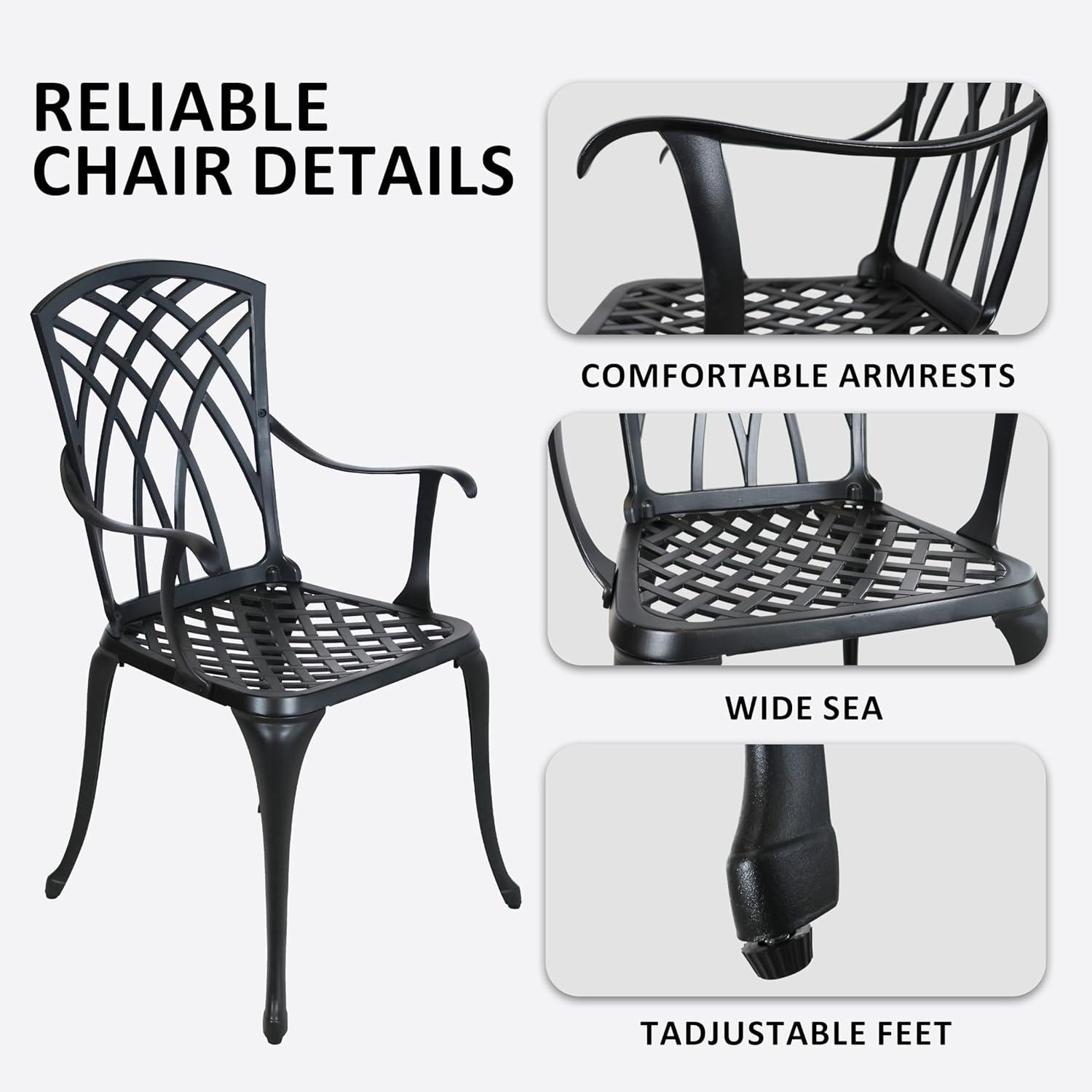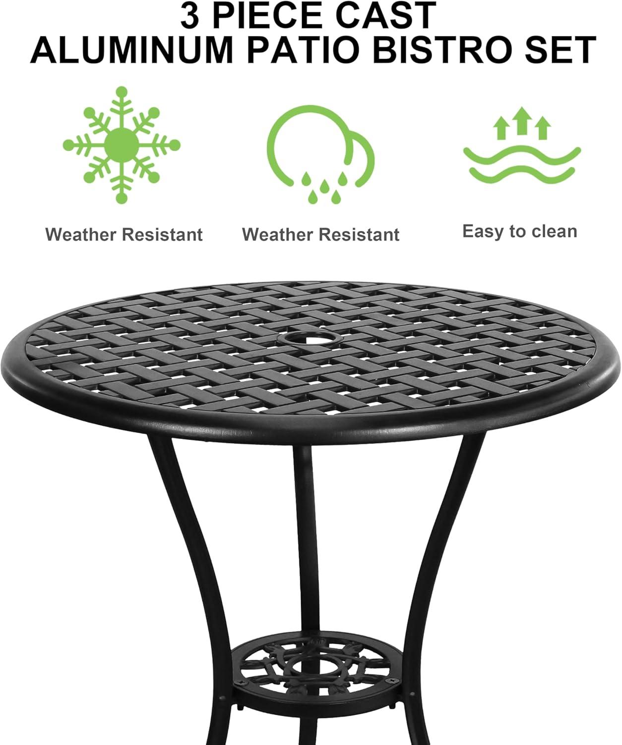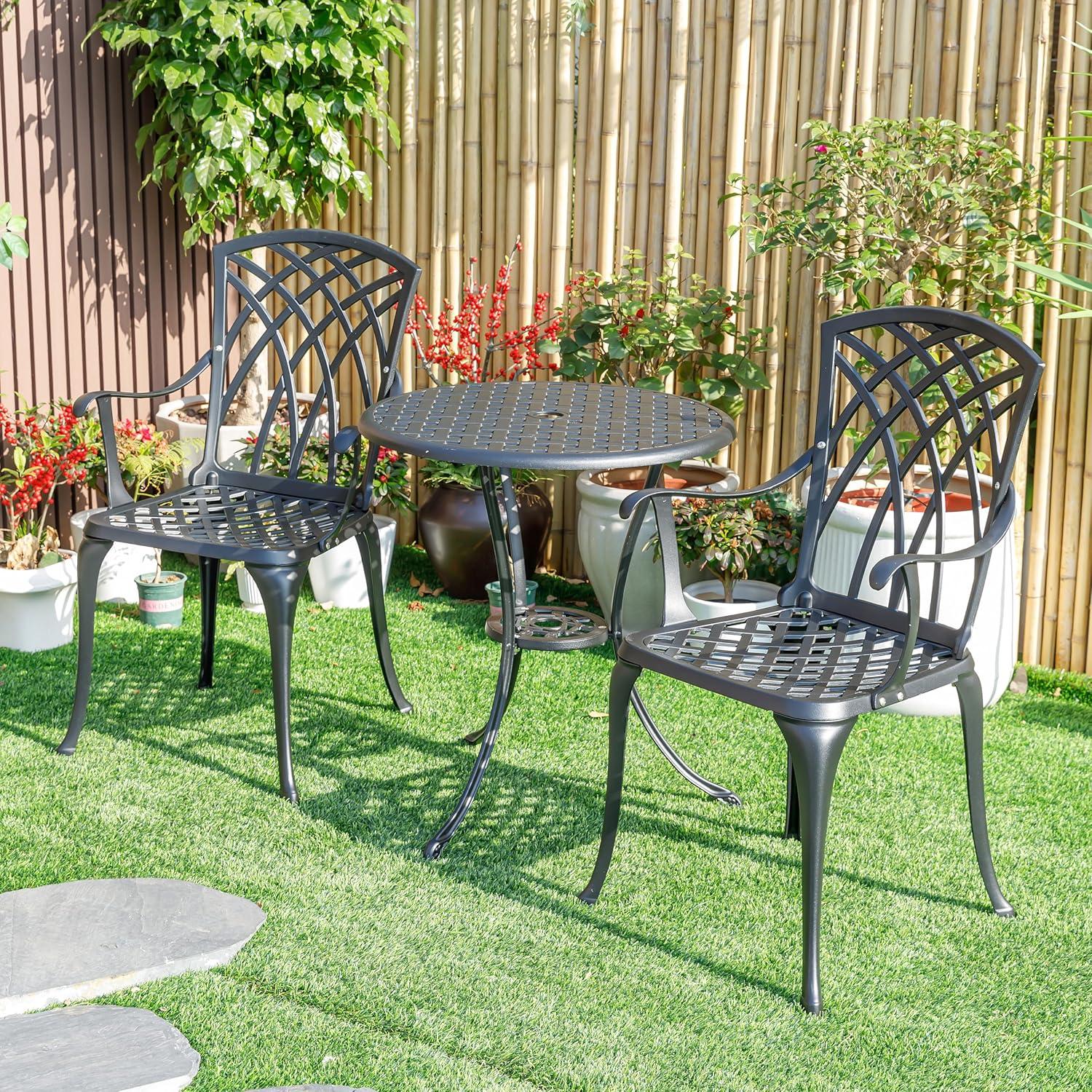 Crafted from premium cast aluminum, this outdoor bistro set stands out for its robust and long-lasting build.The material is naturally resistant to rust and corrosion, ensuring it maintains its sleek black finish through changing seasons. We appreciate that the powder-coated surface adds another layer of protection against wear and tear, meaning it resists fading, chipping, and weathering over time. This durable construction not only enhances the aesthetic appeal with smooth lines and stylish design but also supports a substantial weight capacity of 200 lbs for the table and 396 lbs for each chair, offering sturdy support without compromising on elegance.