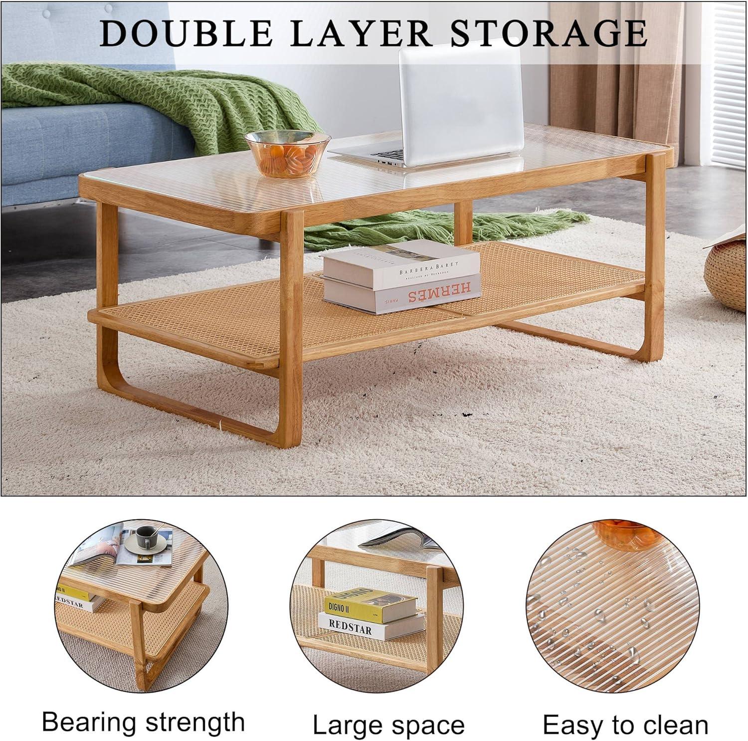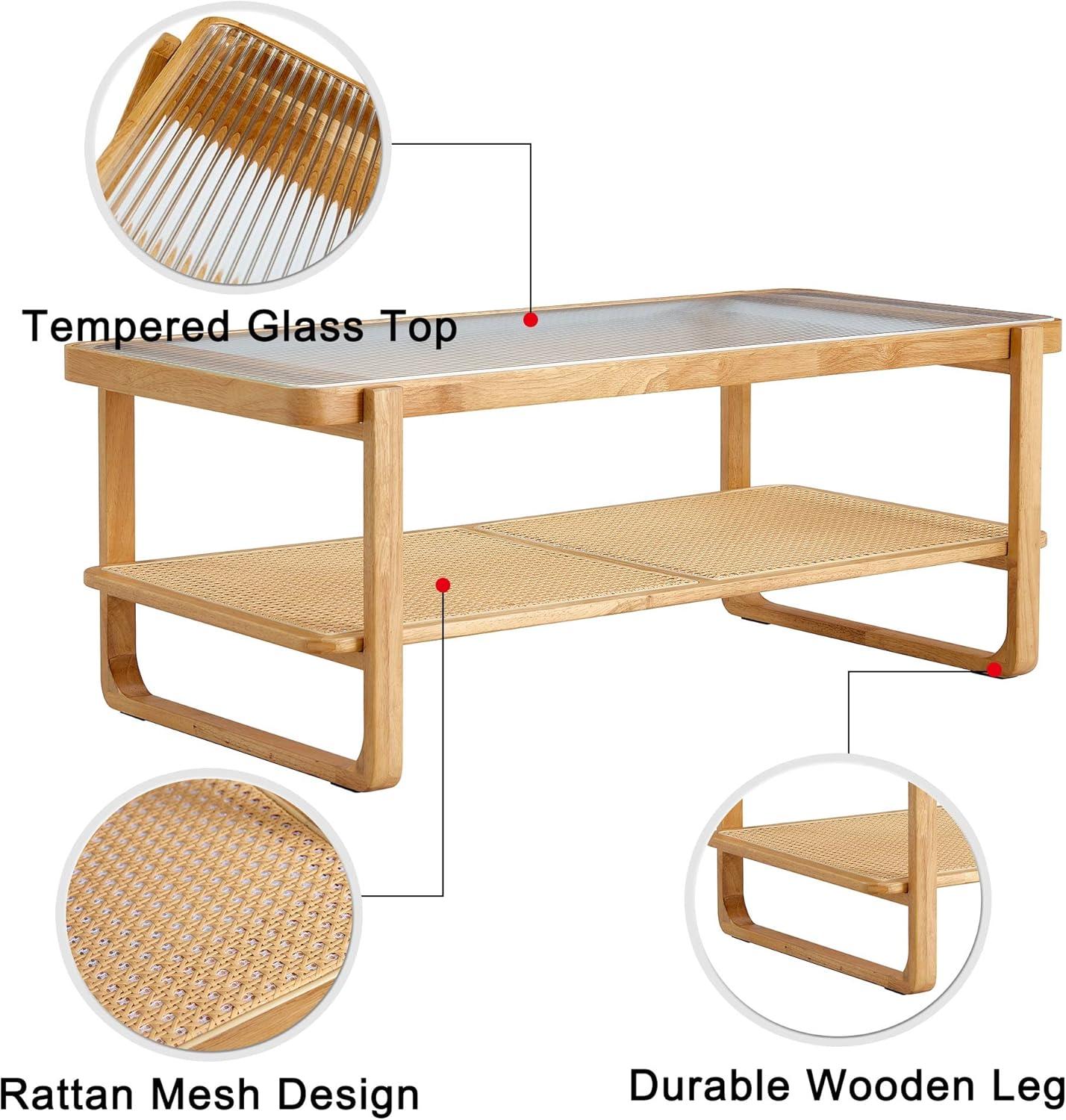 When it comes to durability, the combination of solid wood and tempered glass truly stands out. The solid wood legs are crafted from high-grade raw materials, ensuring high hardness and minimal defects. This results in a stable and sturdy base capable of supporting up to 250 pounds. The tempered glass top not only adds elegance with its transparent, polished surface but also offers resistance against scratches and heat. Adding to the table’s structural integrity is the handwoven rattan mesh on the lower layer, created using ancient cane weaving techniques. This imitation rattan is surprisingly elastic and firm, designed to endure daily use without sagging or damage. The entire table is finished with a protective NC lacquer, providing a smooth finish that helps prevent scratches and enhances longevity.