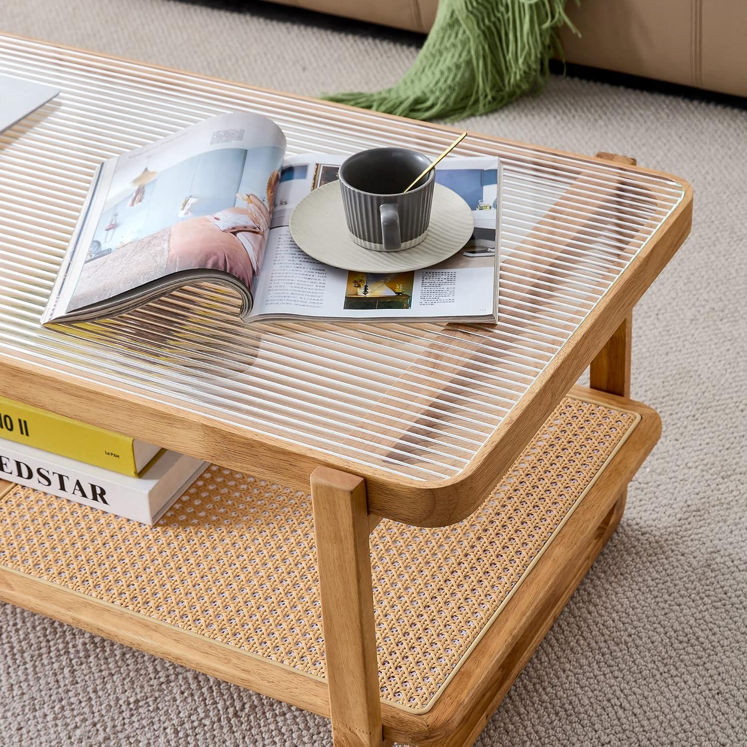 The double-layer design truly enhances the versatility of this tea table, offering practical storage solutions without compromising aesthetics. The top layer, made from horizontal striped tempered glass, provides a smooth, transparent surface that feels cool to the touch and adds an elegant, modern flair. Beneath that, the second layer features a handwoven imitation rattan shelf with a subtle hexagonal weave pattern, blending traditional craftsmanship and contemporary style. This additional tier is perfect for storing books, magazines, or decorative items, helping us keep our living spaces organized and clutter-free while adding a warm, natural texture that contrasts beautifully with the glass and solid wood frame.