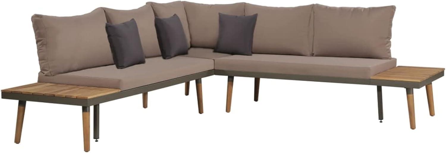 This set perfectly blends style and functionality, making it an excellent choice for those looking to elevate their outdoor living space with a timeless yet modern touch. Its solid acacia wood construction paired with a sturdy steel frame ensures long-lasting durability and stability, even when exposed to varying weather conditions. The thoughtfully designed cushions, made from easy-to-clean polyester, enhance comfort while providing low-maintenance convenience.Whether on a balcony,next to the pool,or in a garden setting,this arrangement conveniently offers ample seating with its two two-seater sofas,a corner sofa,and a handy coffee table – ideal for socializing or relaxing with family and friends.