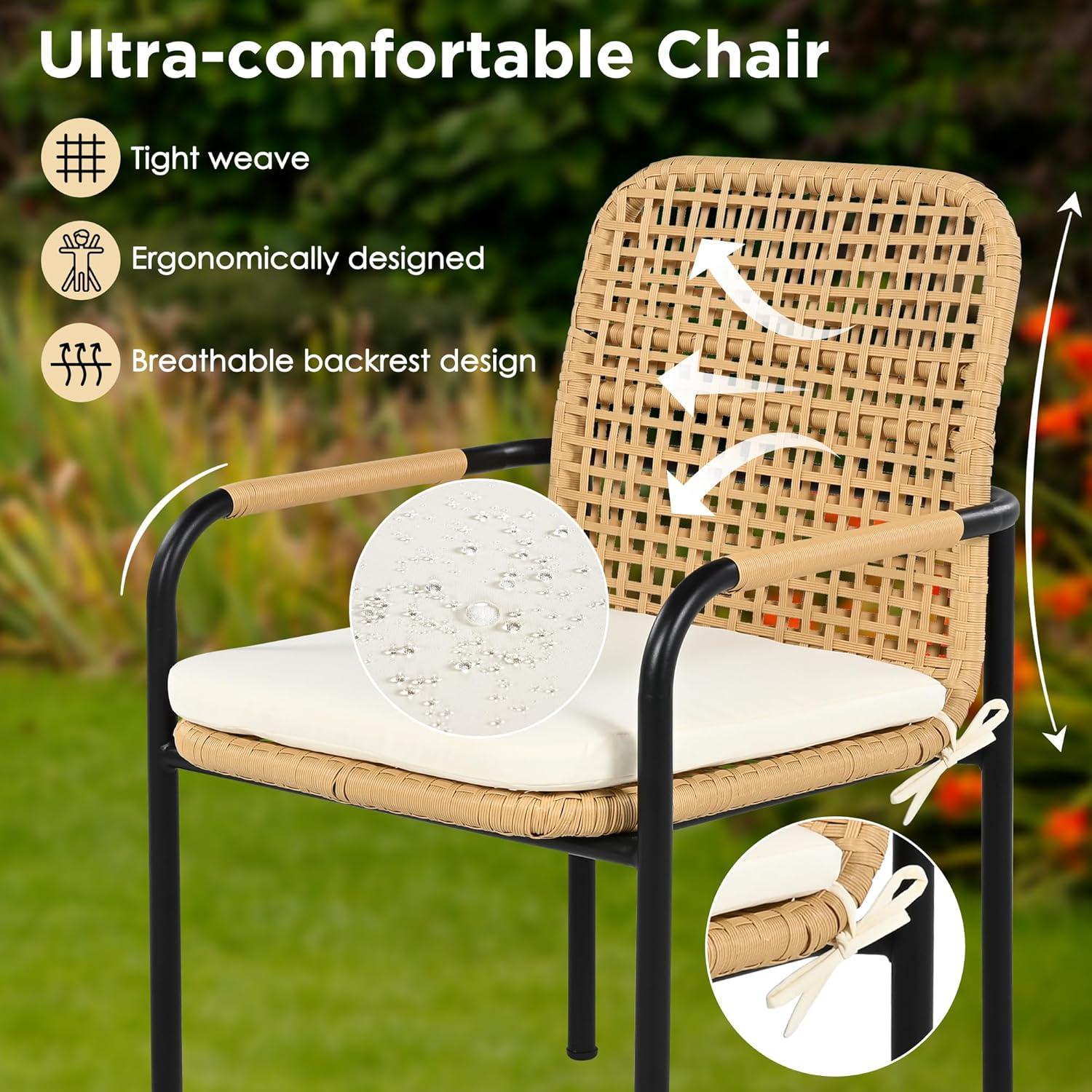 Our time with this outdoor dining set has been remarkably positive, blending both style and functionality effortlessly. the chairs stand out for their remarkable comfort, thanks to the 1.97-inch thick cushions covered with waterproof polyester that adds a layer of softness while being easy to clean. We especially appreciated the option to remove the covers or sit directly on the rattan during warmer days, which kept us pleasantly cool. Each chair supports up to 400 pounds, making the set sturdy enough for guests of varying sizes without any wobbling or unease.