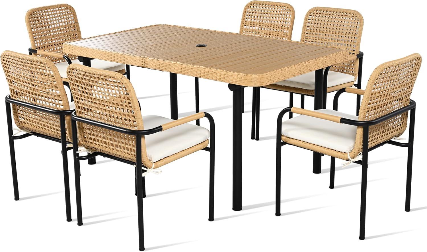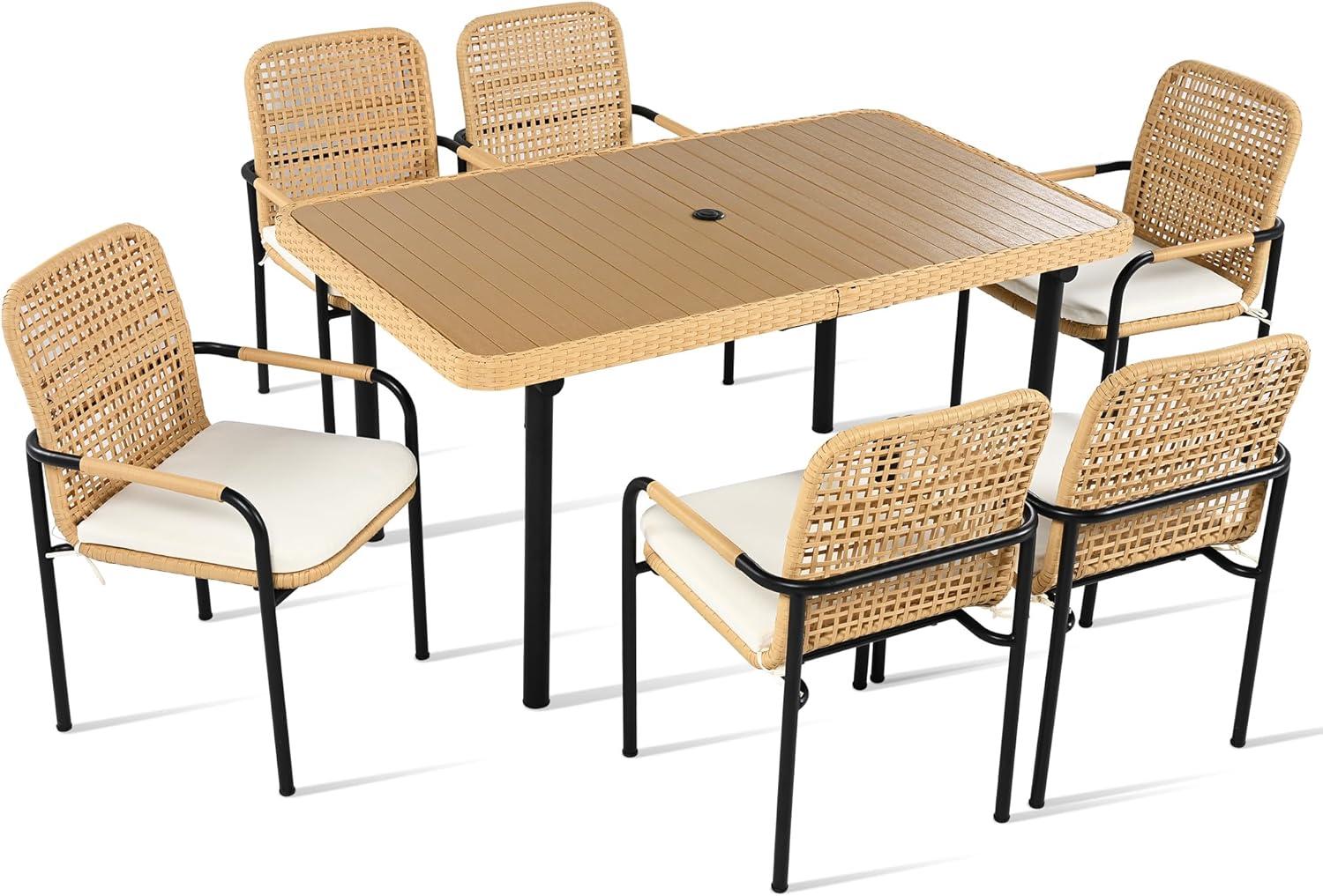 Outdoor living spaces have become an essential extension of our homes, and finding the perfect patio dining set can truly elevate those moments spent with family and friends.Recently, we had the opportunity to test the 7 pieces Patio Dining Set-a blend of stylish outdoor wicker design, durable materials, and thoughtful features like a spacious plastic-wood tabletop with an umbrella hole. Over the past weeks, we’ve used this set in our backyard, experiencing firsthand its comfort, weather resistance, and practical assembly.In this review, we’ll share our insights on how this rattan dining set performed by the poolside, on the patio, and beyond.